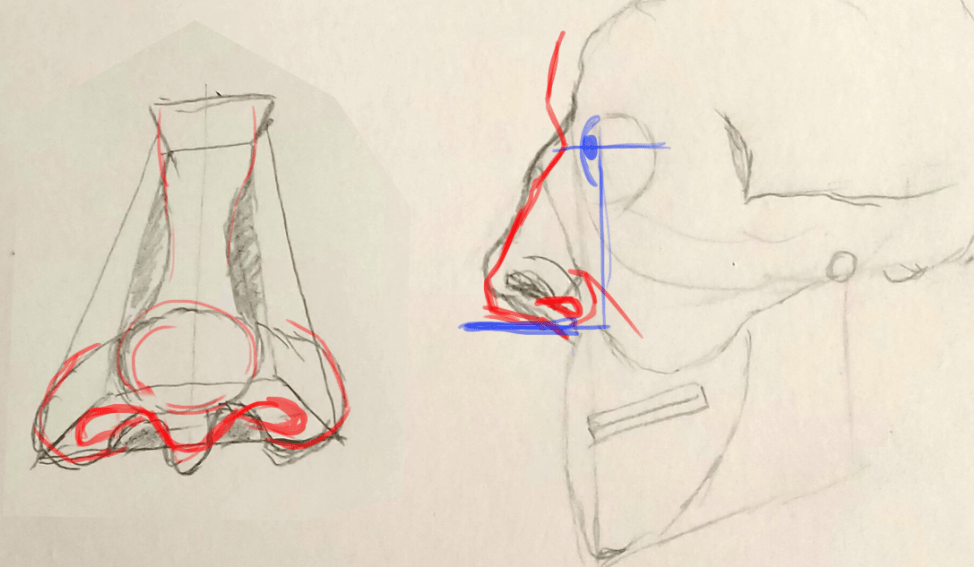Te comparto la corrección de tu ejercicio de nariz. Como puedes ver, las correcciones son sólo pequeños detalles, principalmente en el ancho. ¡Está muy bien hecho!