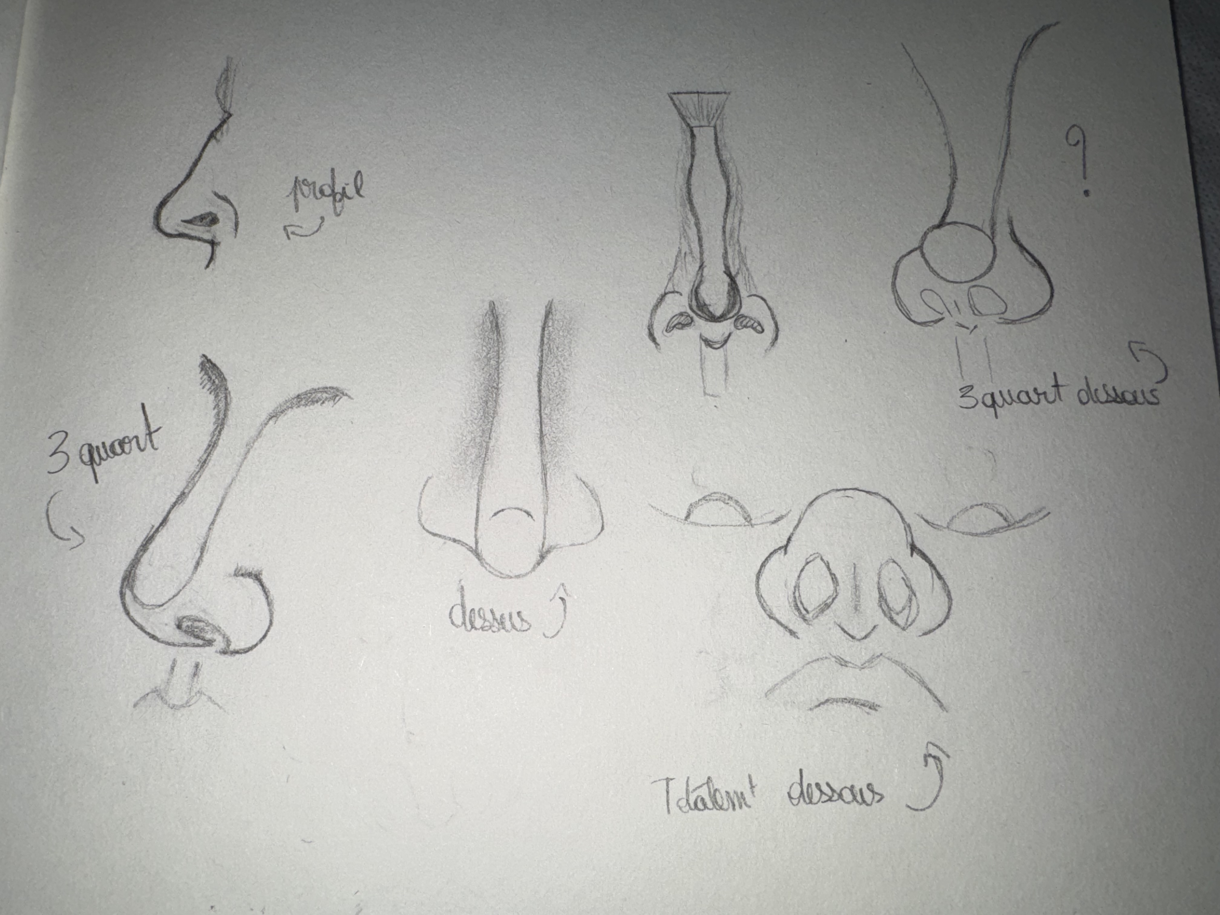 J’ai essayé de reproduire mon nez, plantée devant mon miroir… Certains angles sont mieux réussis que d’autres, mais celui tout à droite (avec le point d’interrogation) me pose beaucoup de problèmes. J’ai beau réessayer, je n’arrive pas à comprendre comment faire…