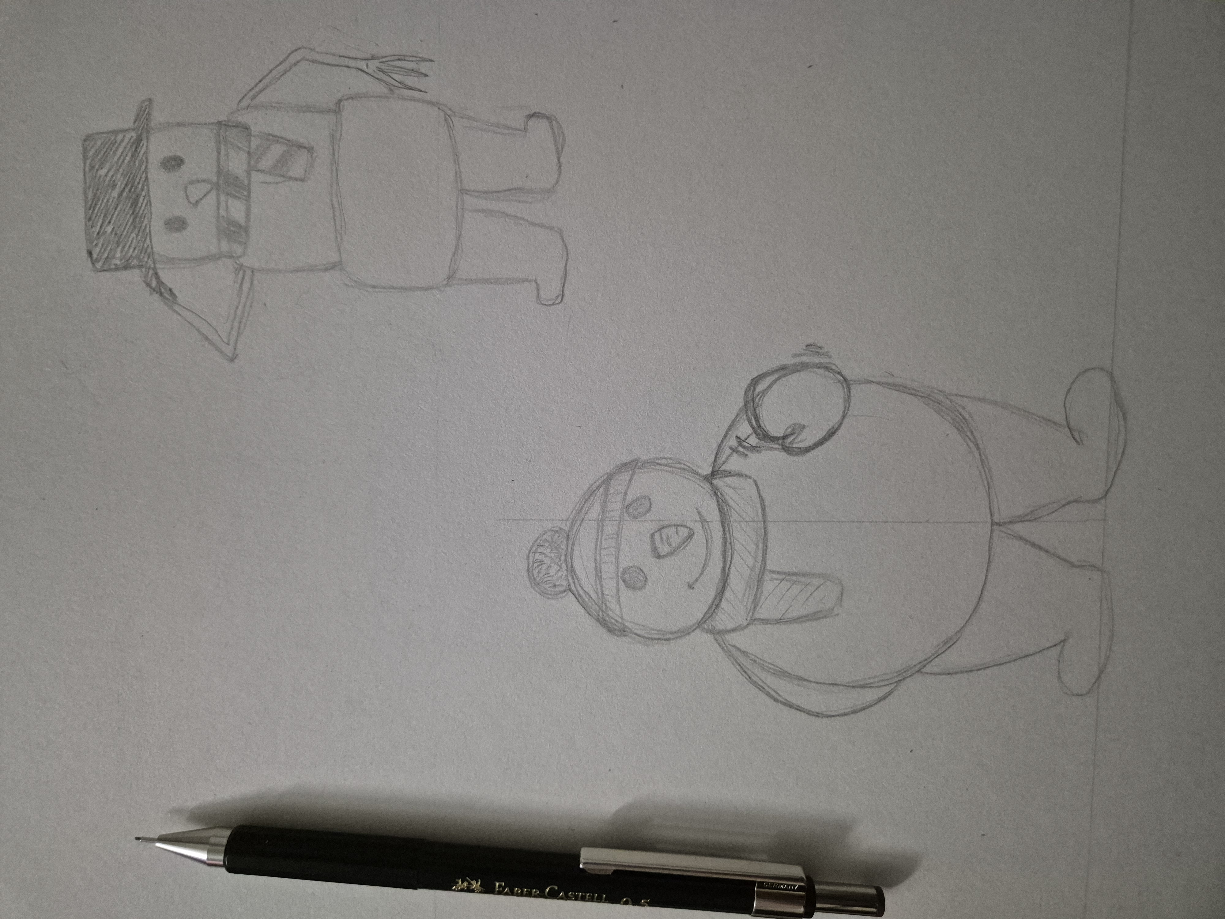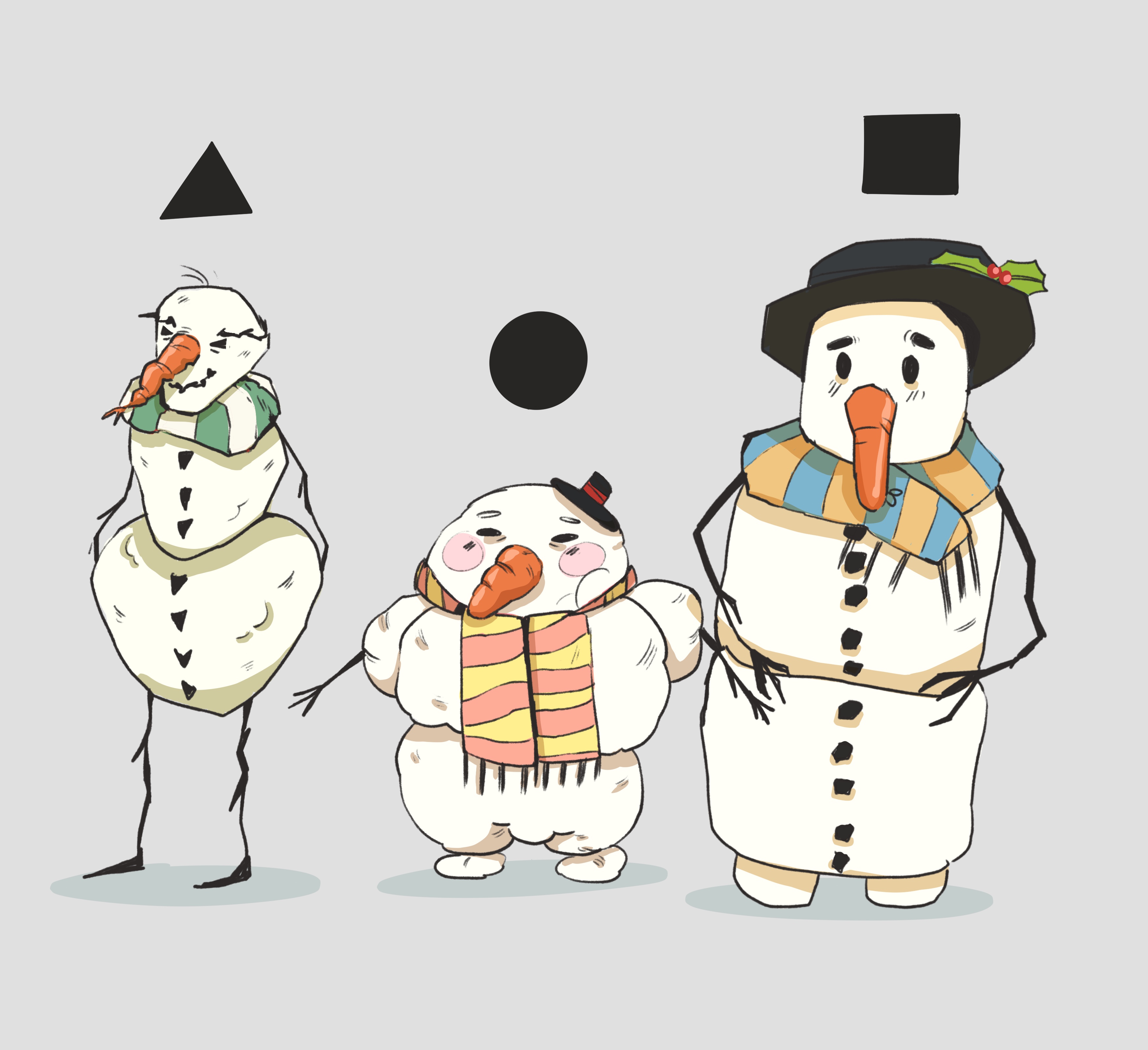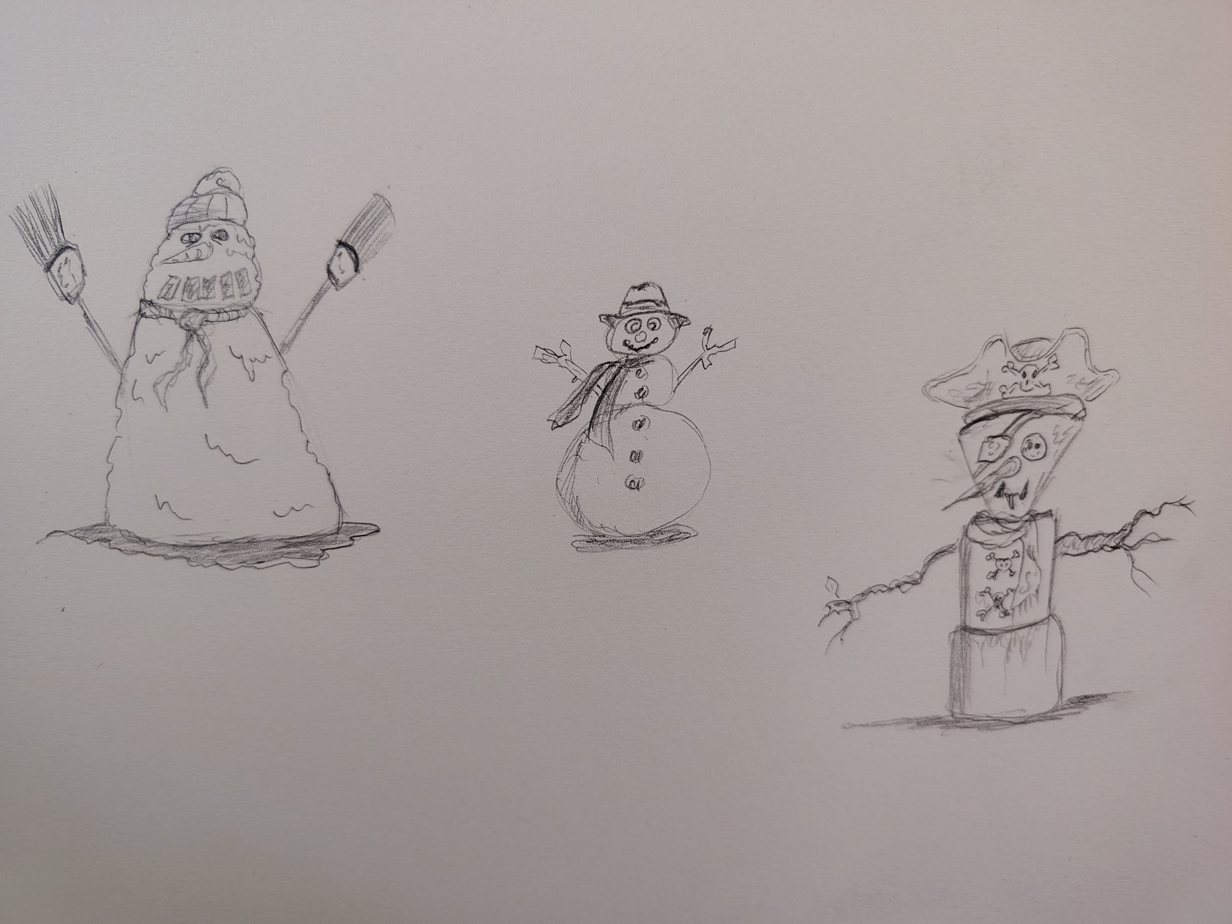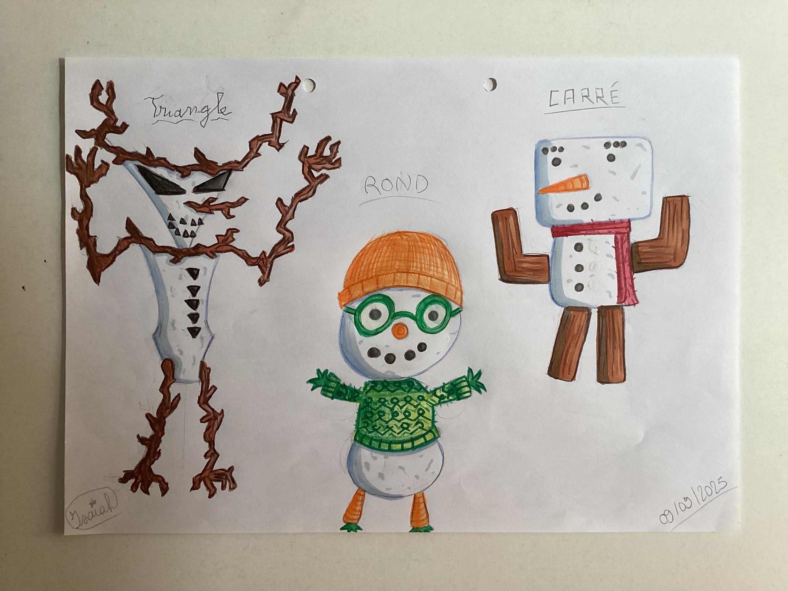 C'est vraiment pas mal ! Tu as bien compris comment simplifier les formes générales 👍 Ton bonhomme de neige triangle ressort plutôt bien, n'hesite pas a retravailler un peu le carré pour qu'on est vraiment cette impression de bloc, il est un peu trop par endroit :)