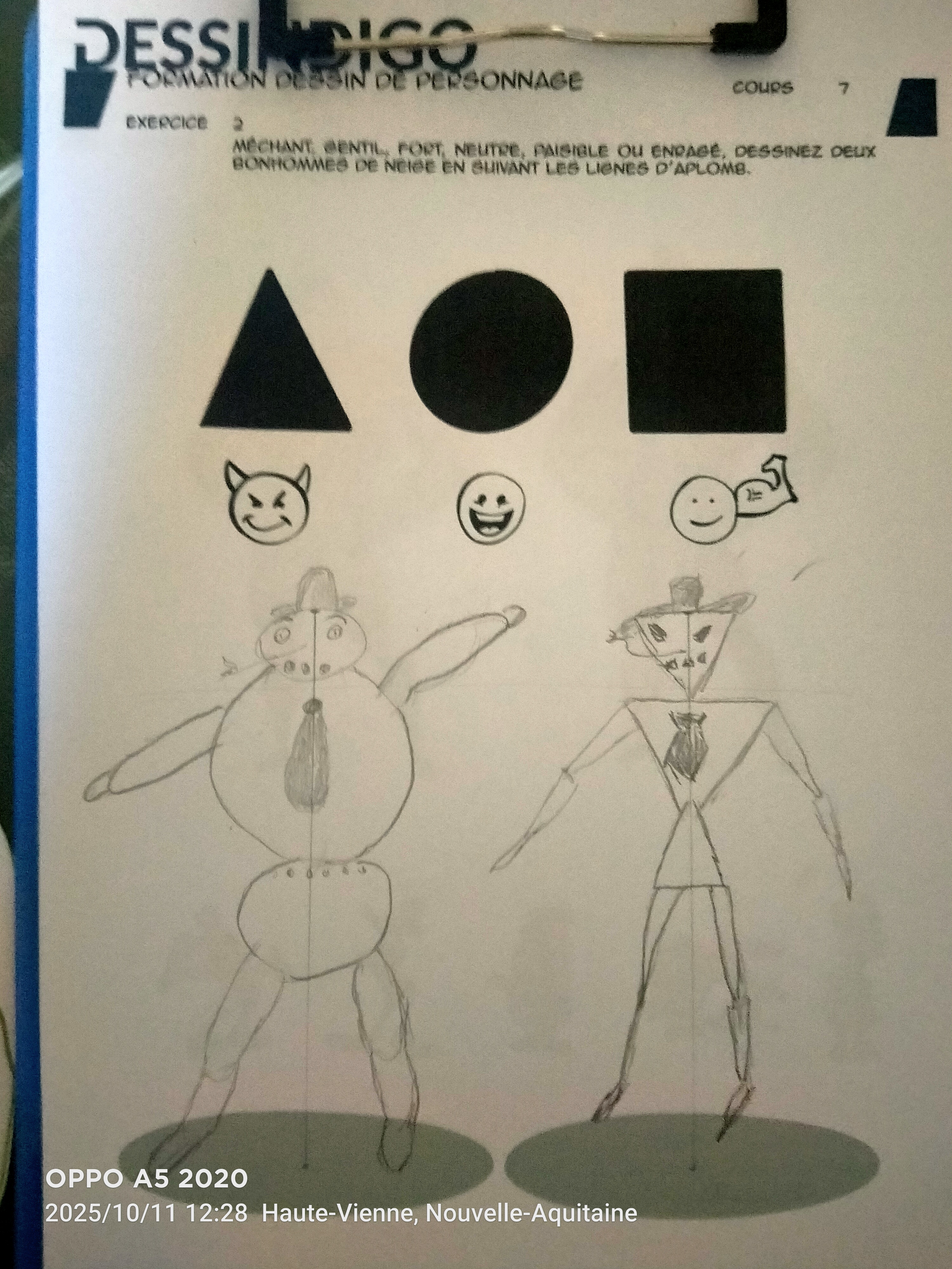 A part ça, ton exercice est top ! On sent bien la personnalité à la fois dans le design que tu leur a donner et dans le langage des formes. Tu aurais pu légèrement exagérer pour le bonhomme carré, par exemple en faisant un cube à la place du cercle pour sa tête, mais ça reste du détail, bravo c'est réussit ! 👍
