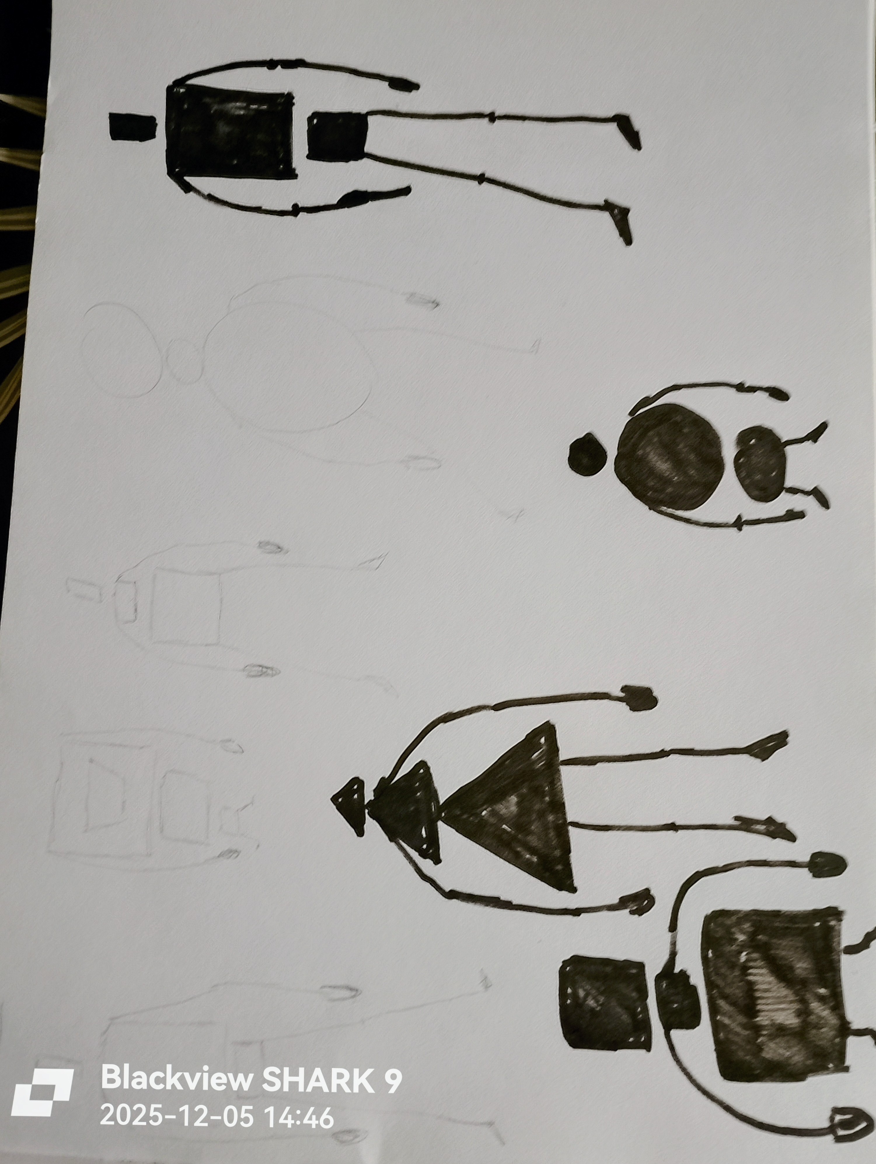 Bonsoir Sylvain, super pour cet exercice des formes simples. Le dernier à droite me fait penser à H2G2 il fonctionne bien ! Tes versions en noir sont très parlantes aussi, tu peux flechir les bras ou leur donner une dynamique en courbe pour éviter un côté trop robotique