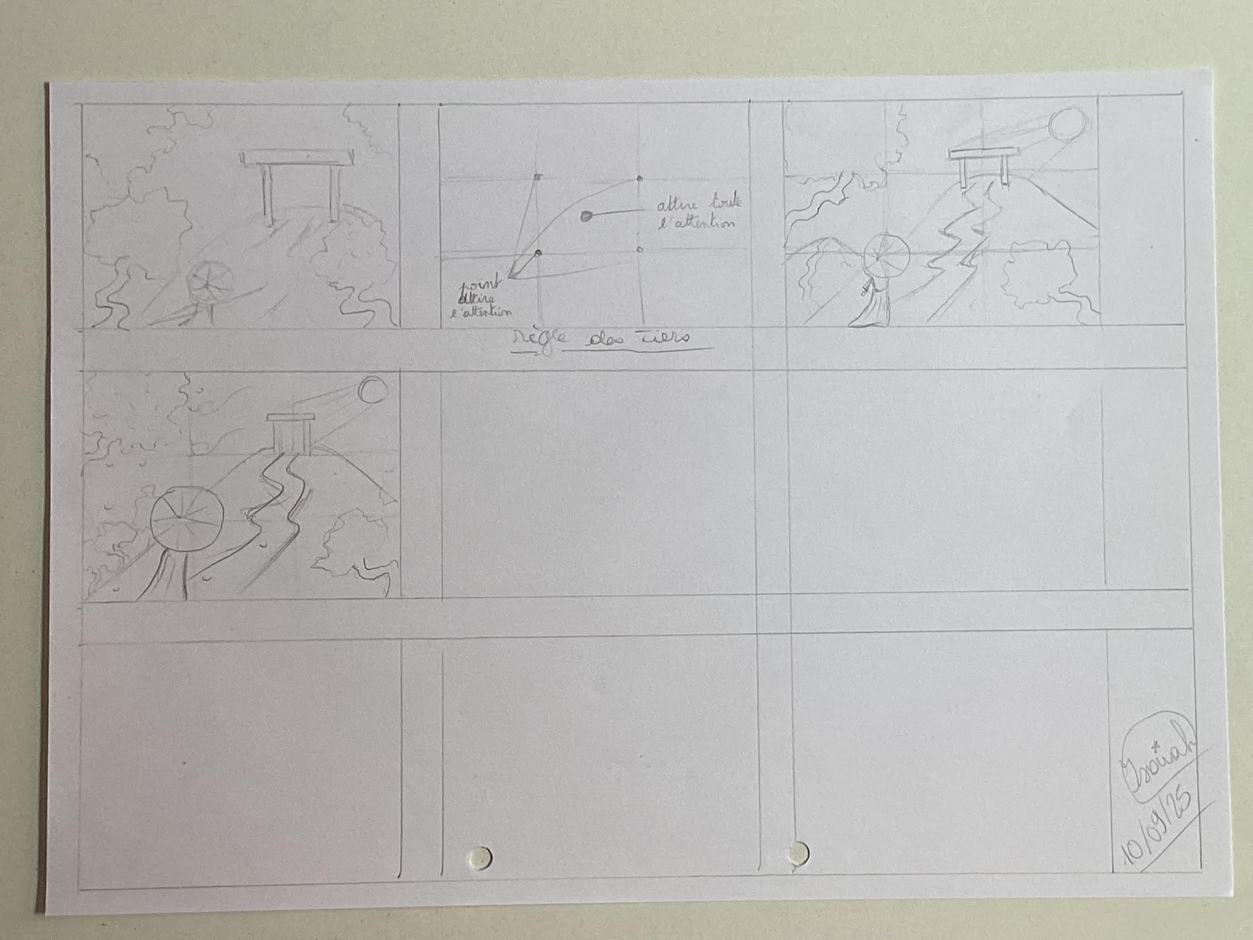 Malgré tout, mon premier conseil c'est de laisser des espaces de ciel dans la ligne d'horizon, afin de donner plus d'espaces de respiration qui vont aider à donner l'impression de distance et de grands espaces. on va essayer de garder les détails importants vers le tiers de la largeur, vu que c'est là ou l'oeil va se porter.