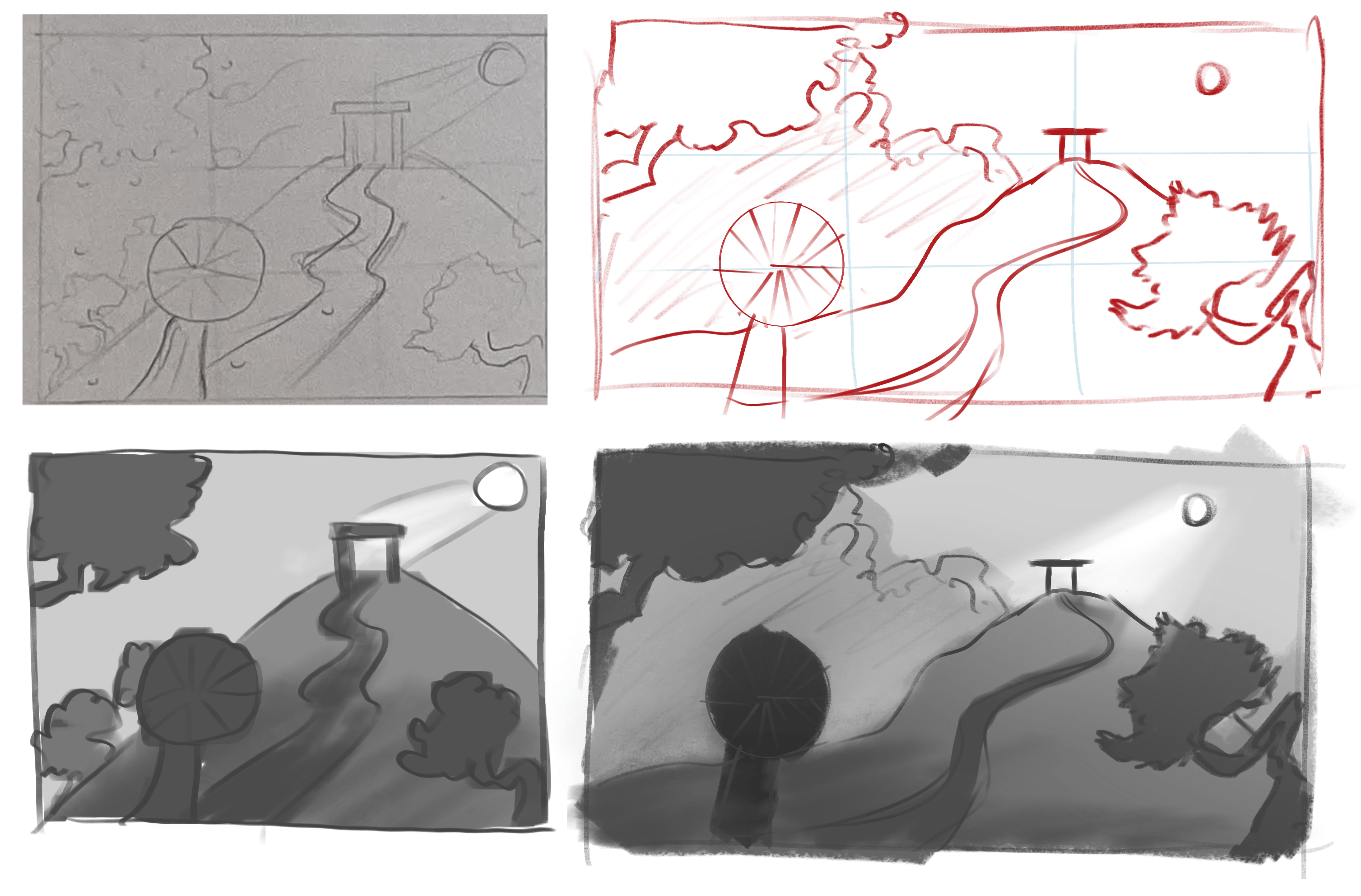 Ensuite, on va essayer de simplifier l'arrière plan en plusieurs bandes de paysages à des profondeurs et hauteurs différentes, sur lesquelles on pourra dessiner des bâtiments. les bandes superposées ont donner de la profondeur et l'impression que c'est une ville entière sans avoir à dessiner chaque maison. En fait, plus un objet est loin plus il est aplati par la perspective, et donc on va aussi desssiner le chemin vers le chateau en zigzag, pour montrer que le chemin est long et que la ville est grande, et donner cet effet d'aplati.