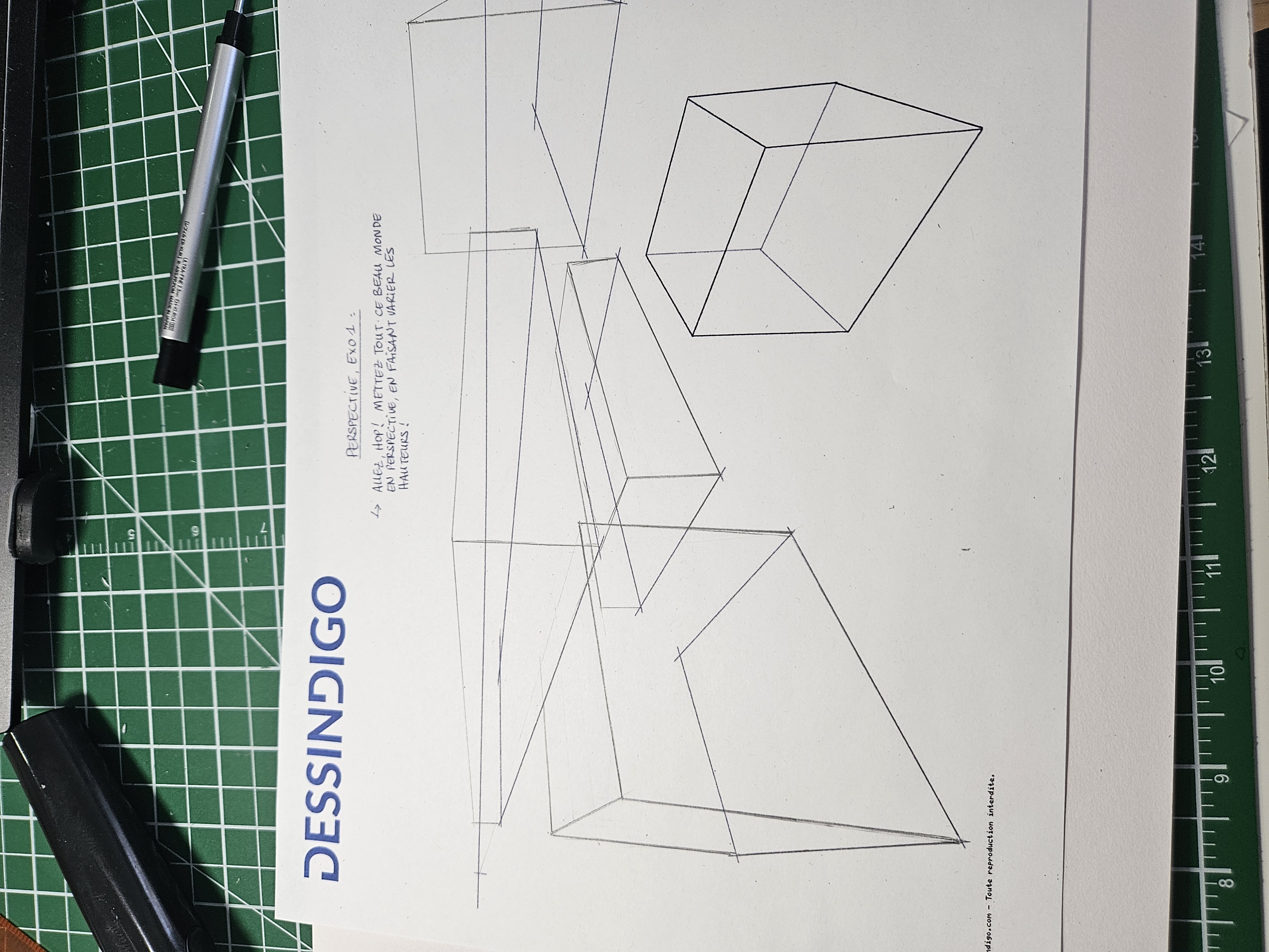 Bonjour, voici mon exercice. En haut a droite avec le premier plan incliné et le plan parallèle biseauté un peu comme une rampe. Celui en bas à gauche avec le fond en pointillé pour laisser l'impression de la vue depuis le haut d'un immeuble avec les verticales qui ne se finissent pas mais qui rejoignent un même point de fuite ;) ( point de fuite fait avec une feuille en dessous afin de prolonger précisément les verticales) mer i pour les corrections ☺️