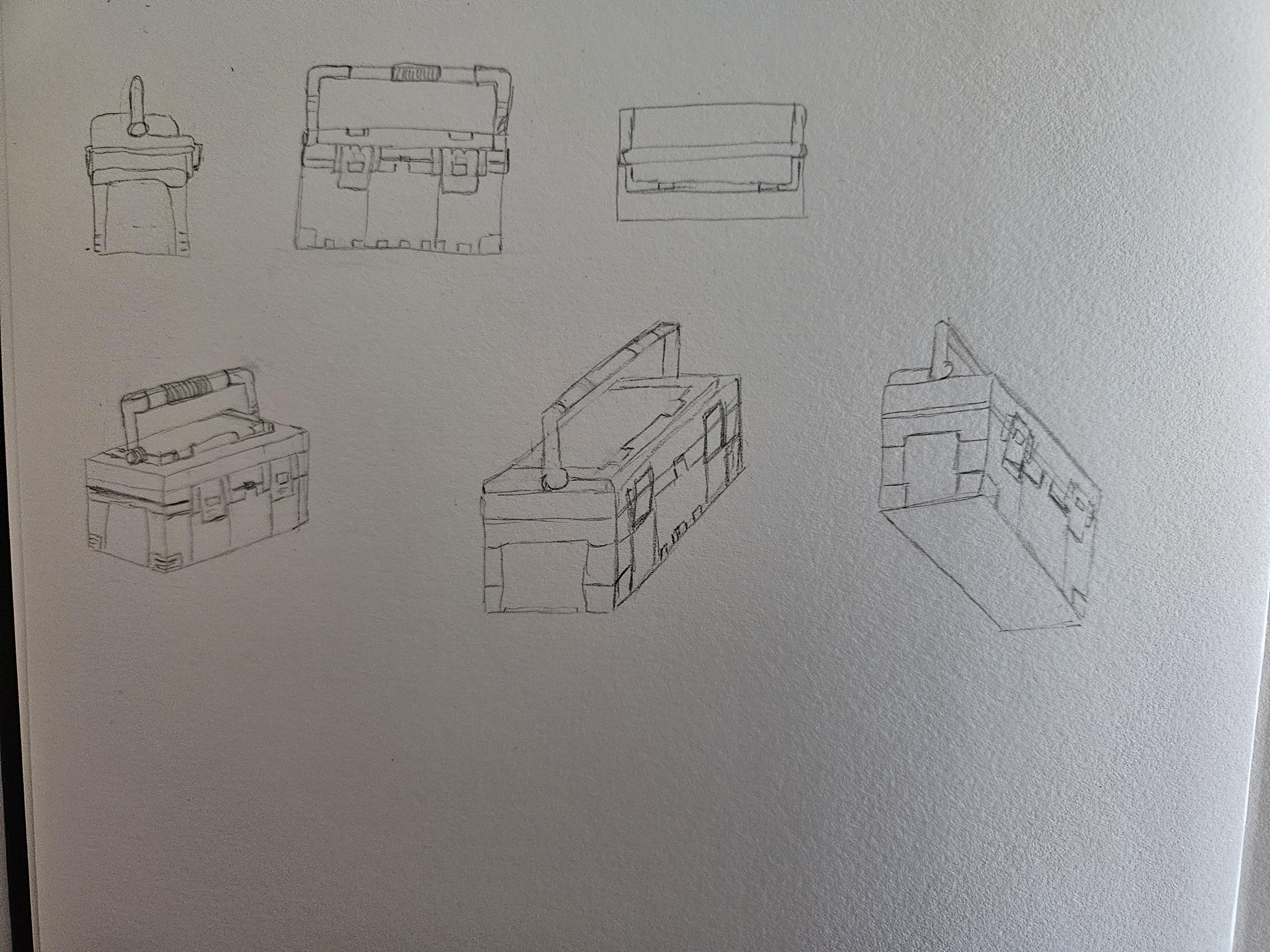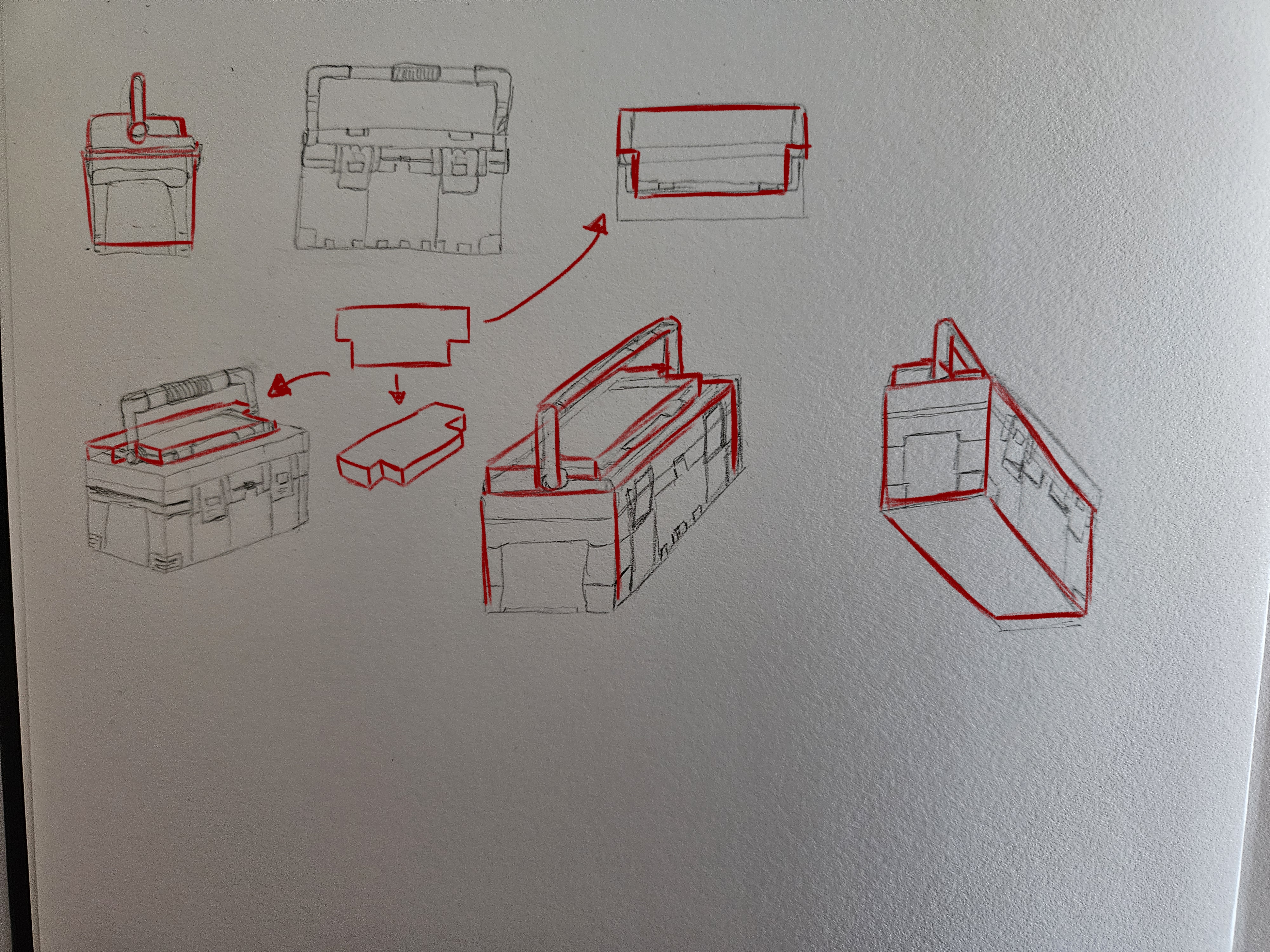 Salut Temp, beau boulot sur ta caisse à outils! Des petites variations de volume, mais rien de trop embêtant. Attention avec les lignes de fuites de la vue de dessous. Sinon, la partie qui est un peu approximative, c'est le dessus de la caisse. Mais je comprends que la forme n'aide pas. Il faut simplifier ce que tu vois, dans une simple vue géométrique, ensuite tu pourras plus facilement la mettre en perspective. :)
