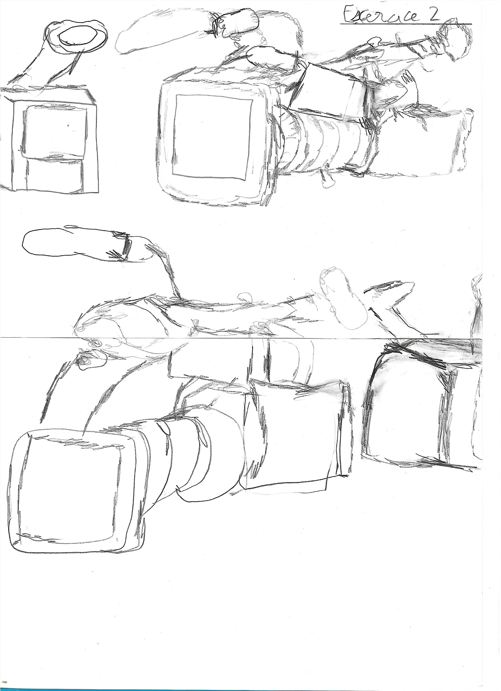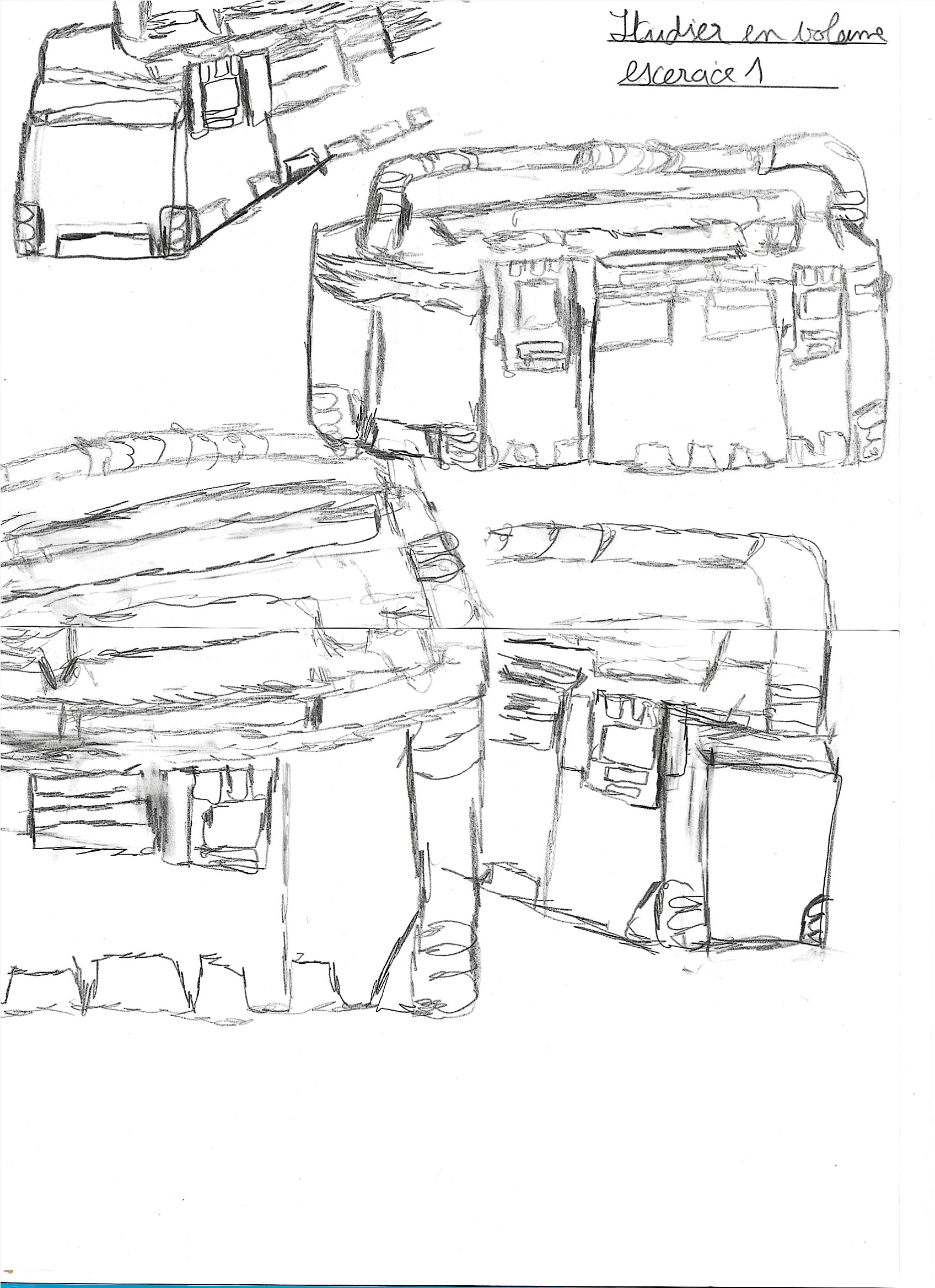 Tes croquis sont sur la bonne voie : tu as réussi à représenter les différentes pièces des objets ainsi que certaines perspectives. Je te recommande d'améliorer les qualités de ton trait pour faire des lignes plus définies et plus droites, ainsi que de planifier à l'avance l'espace que tu vas allouer à chaque croquis. Une bonne répartition te permettra de dessiner avec liberté sans que les dessins ne se chevauchent.