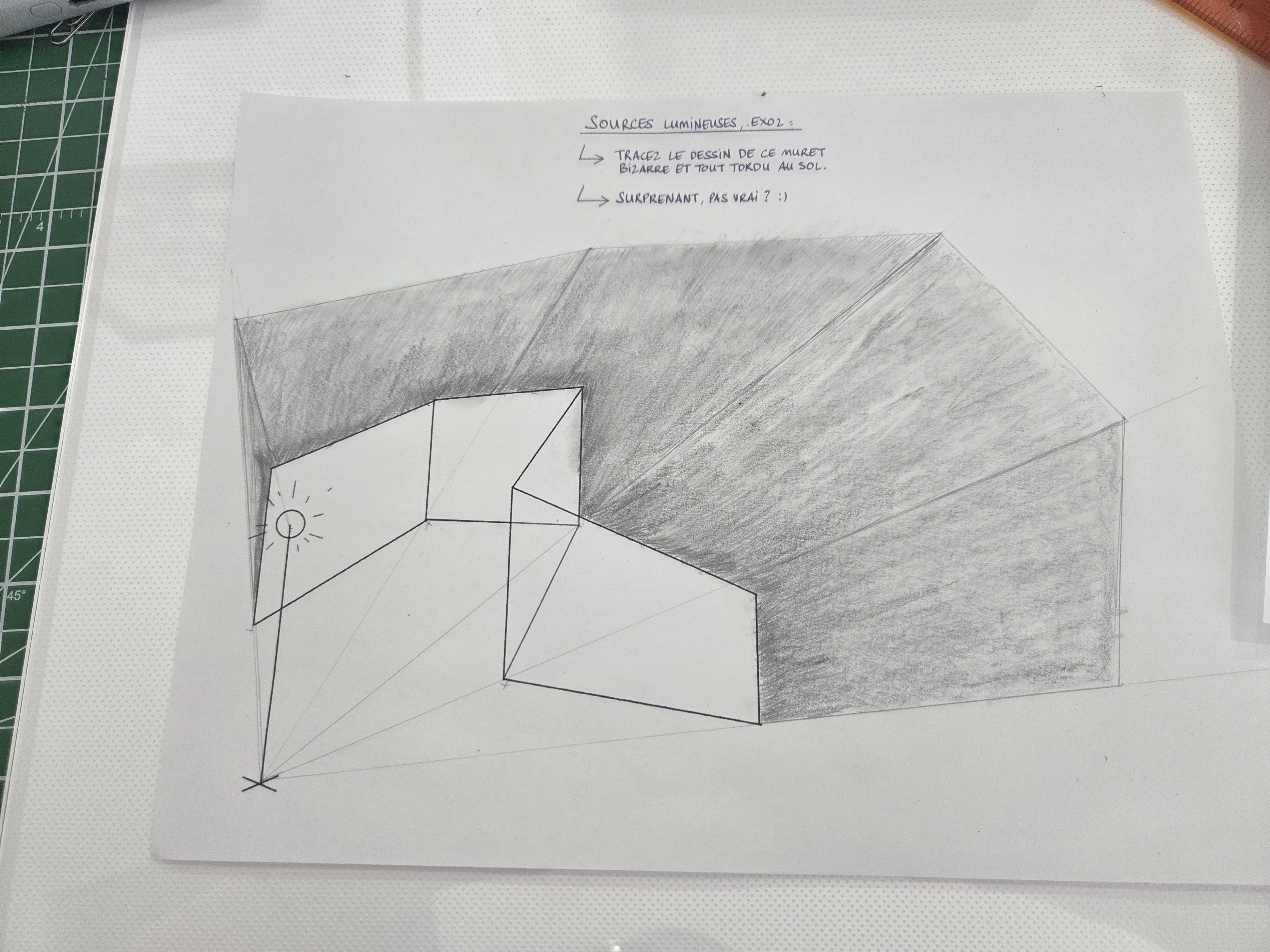 Ton exercice est très bien ! Tu as correctement suivi les lignes de référence pour projeter les ombres, c'est un point positif pour toi ! De plus, l'utilisation de différentes intensités d'ombre donne une touche stylistique qui rend l'intensité du contraste encore plus claire. Excellent !