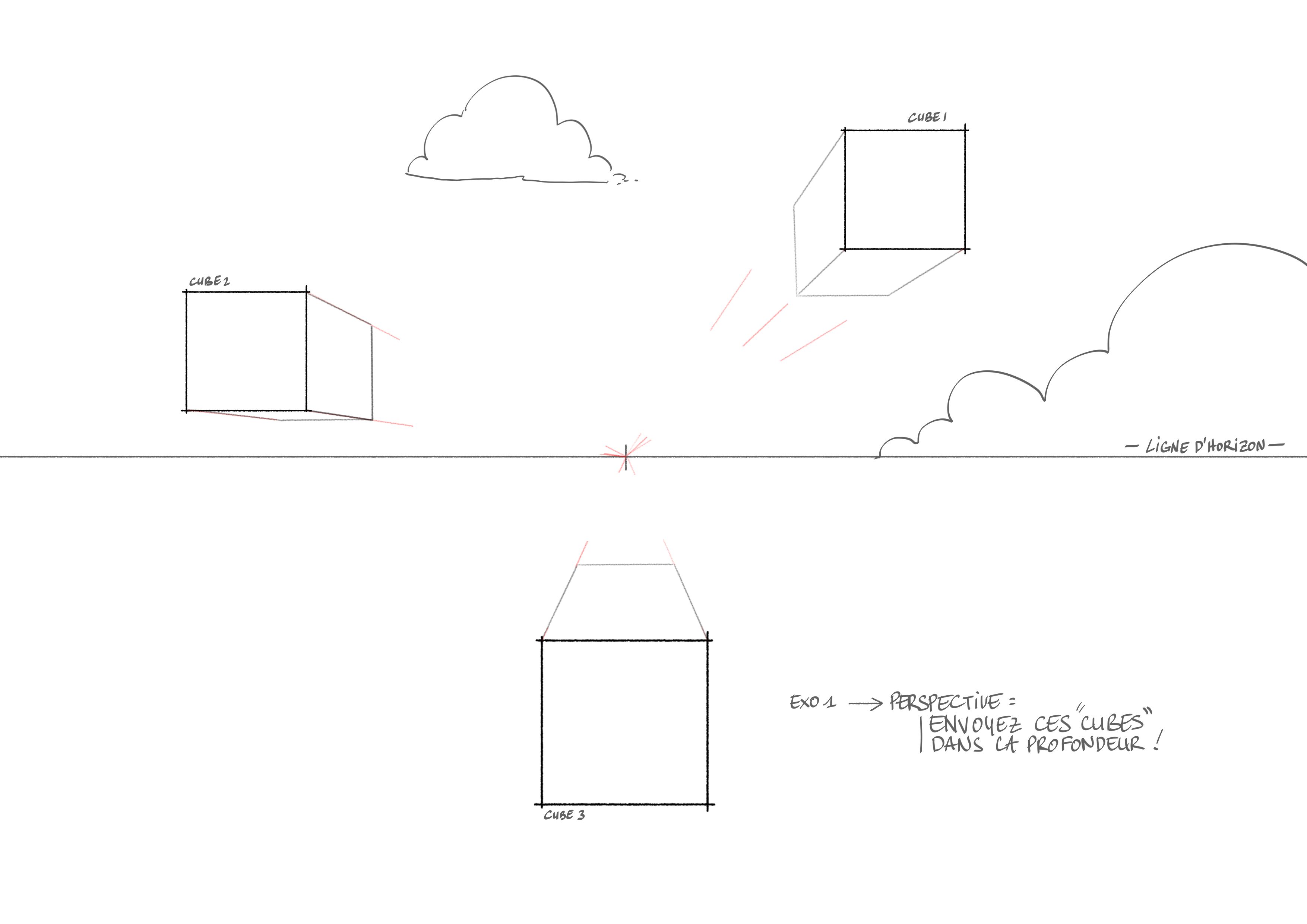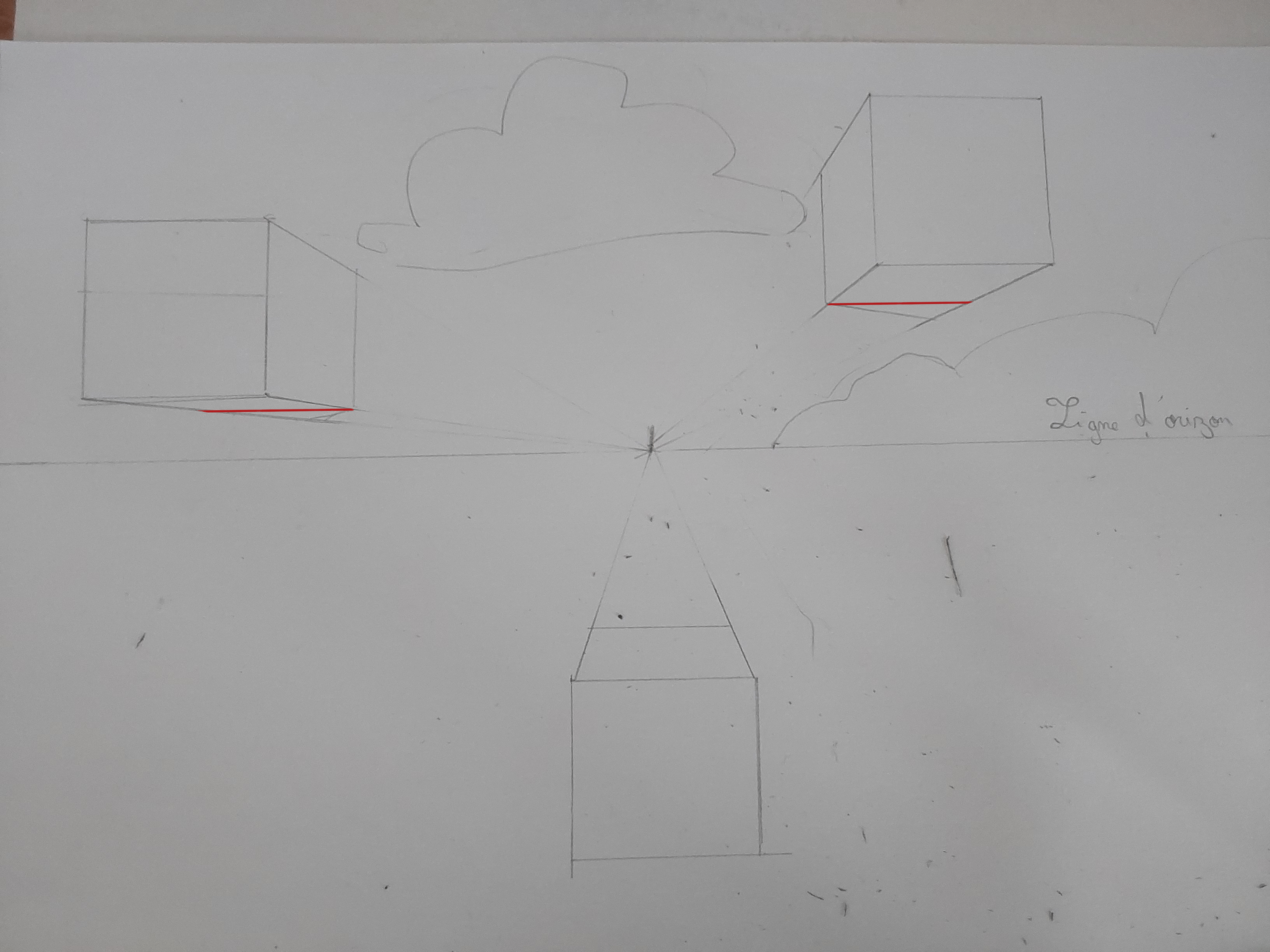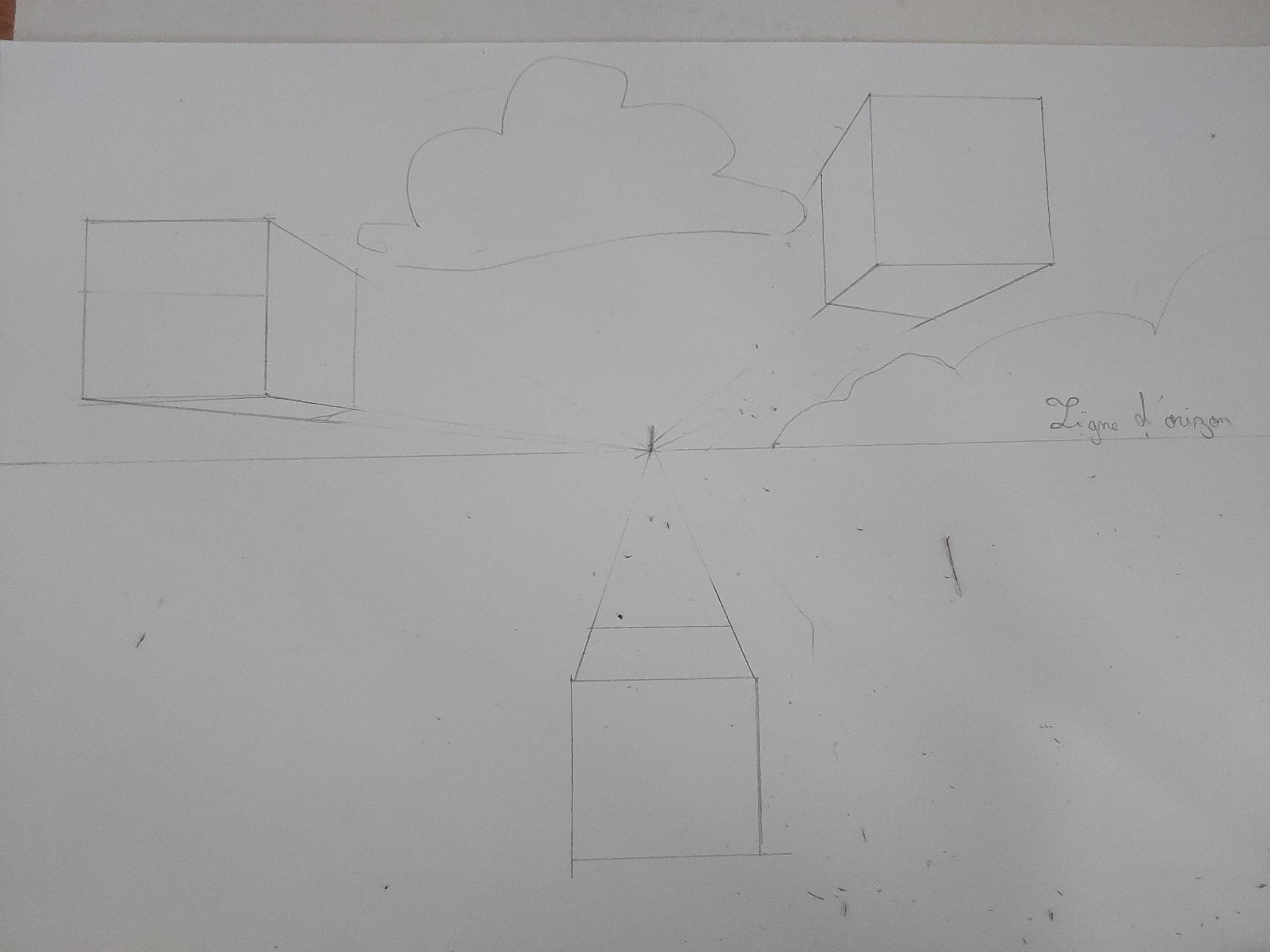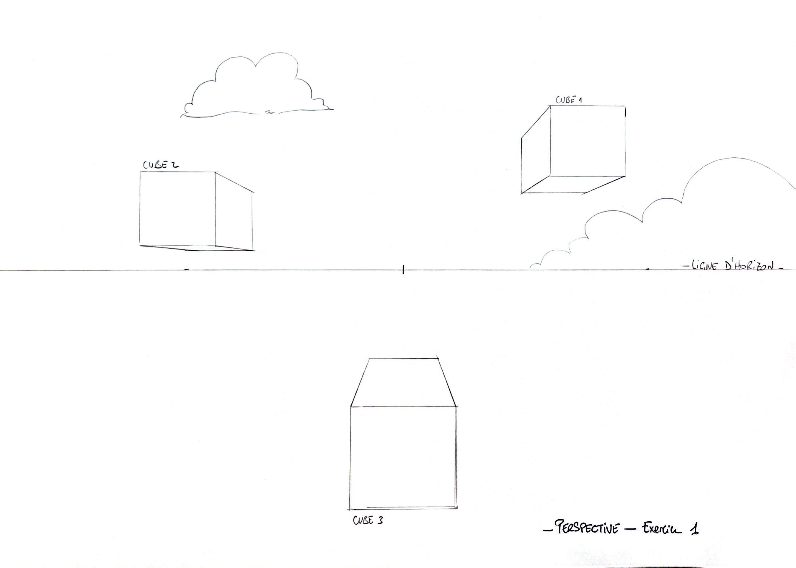 Coucou! Voici mon exercice 1 sur la perspective. Je n'ai plus d'encre dans mon imprimante, alors en attendant que j'aille en acheter, j'ai décidé de m'amuser à dessiner les petits nuages et les carrés 😀