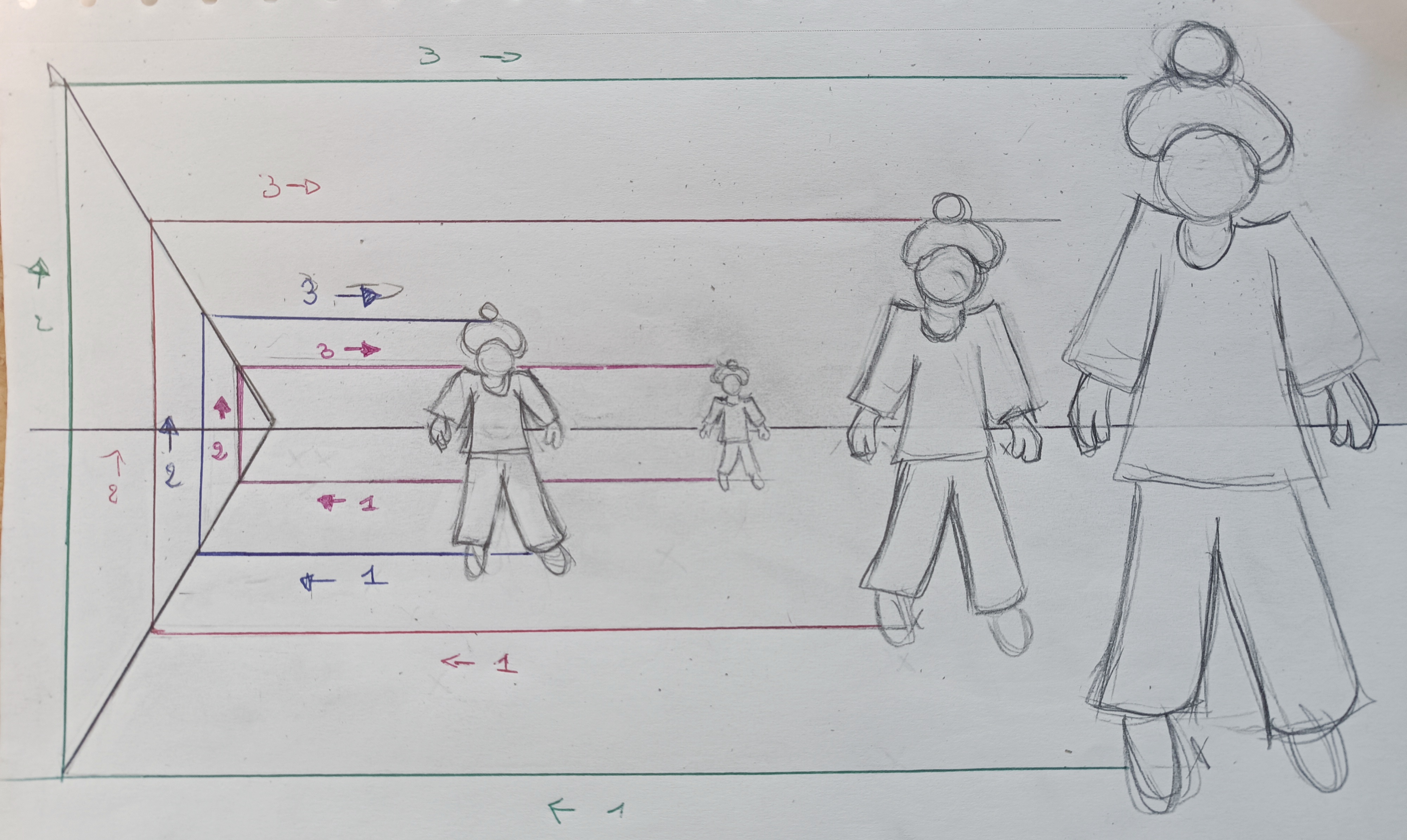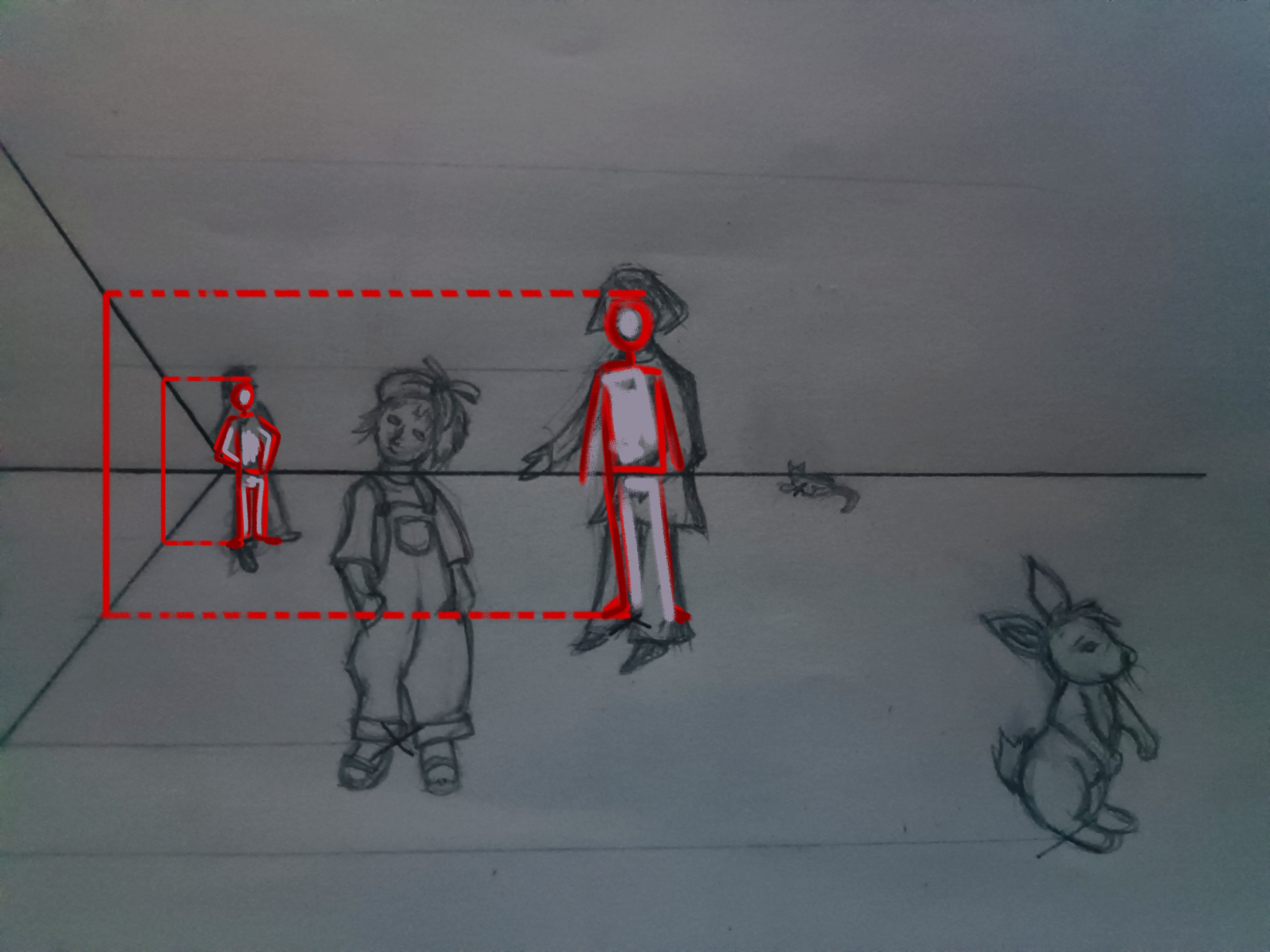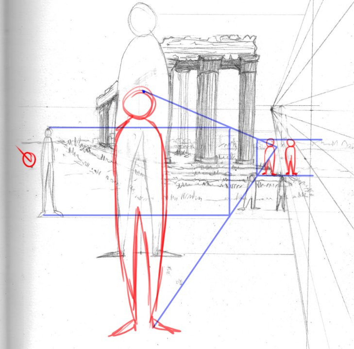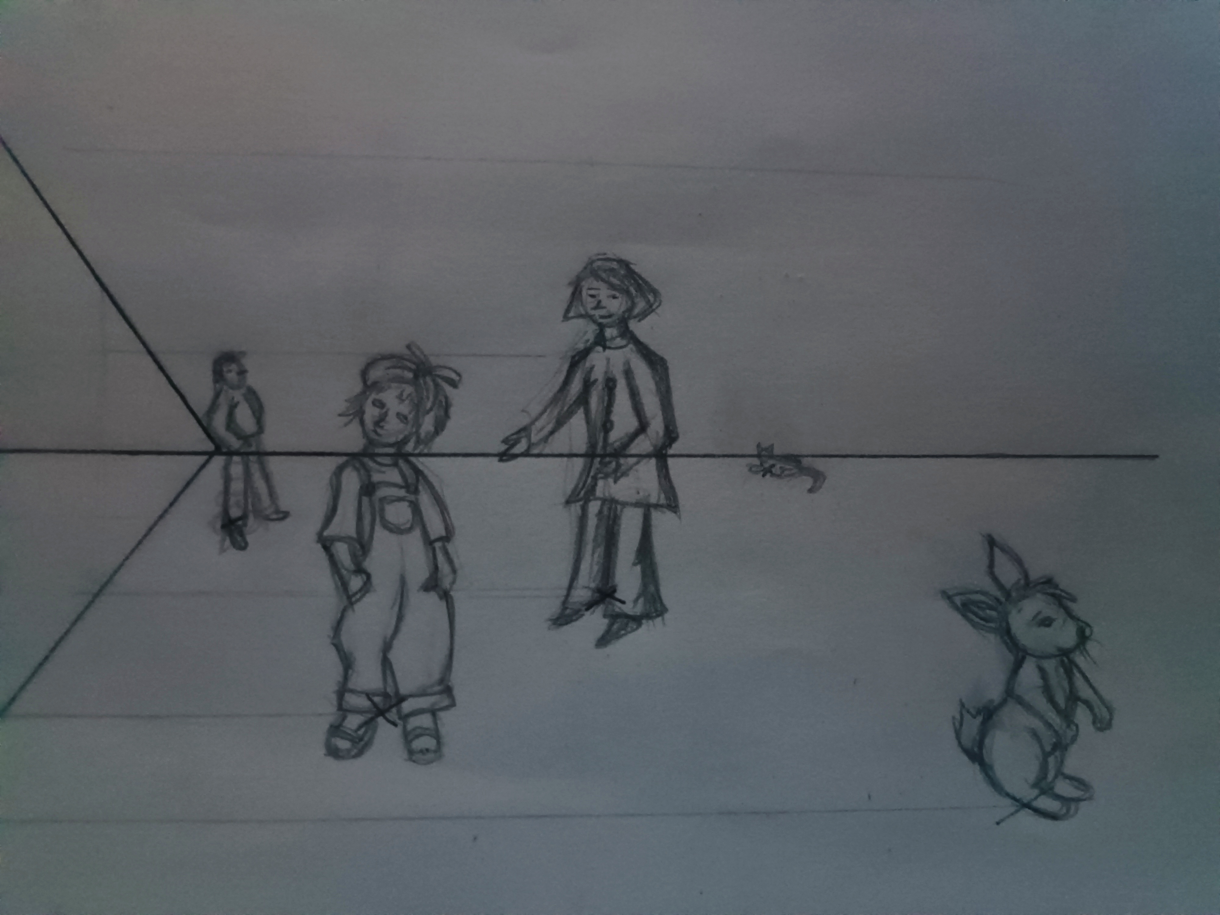 Bonsoir Viedetapassion. Attention, en dessinant des personnages de tailles différentes (adultes, enfants et animaux), l'exercice ne te sers pas vraiment. Le but est de pouvoir reporter la hauteur d'un objet ou d'un personnage dans la profondeur. Tu n'es pas obligé de dessiner des personnages précis et terminer, même une silhouette suffit pour réaliser cet exercice. Selon son emplacement sur les différentes croix tu dois définir sa taille dans les différentes profondeurs. ;)