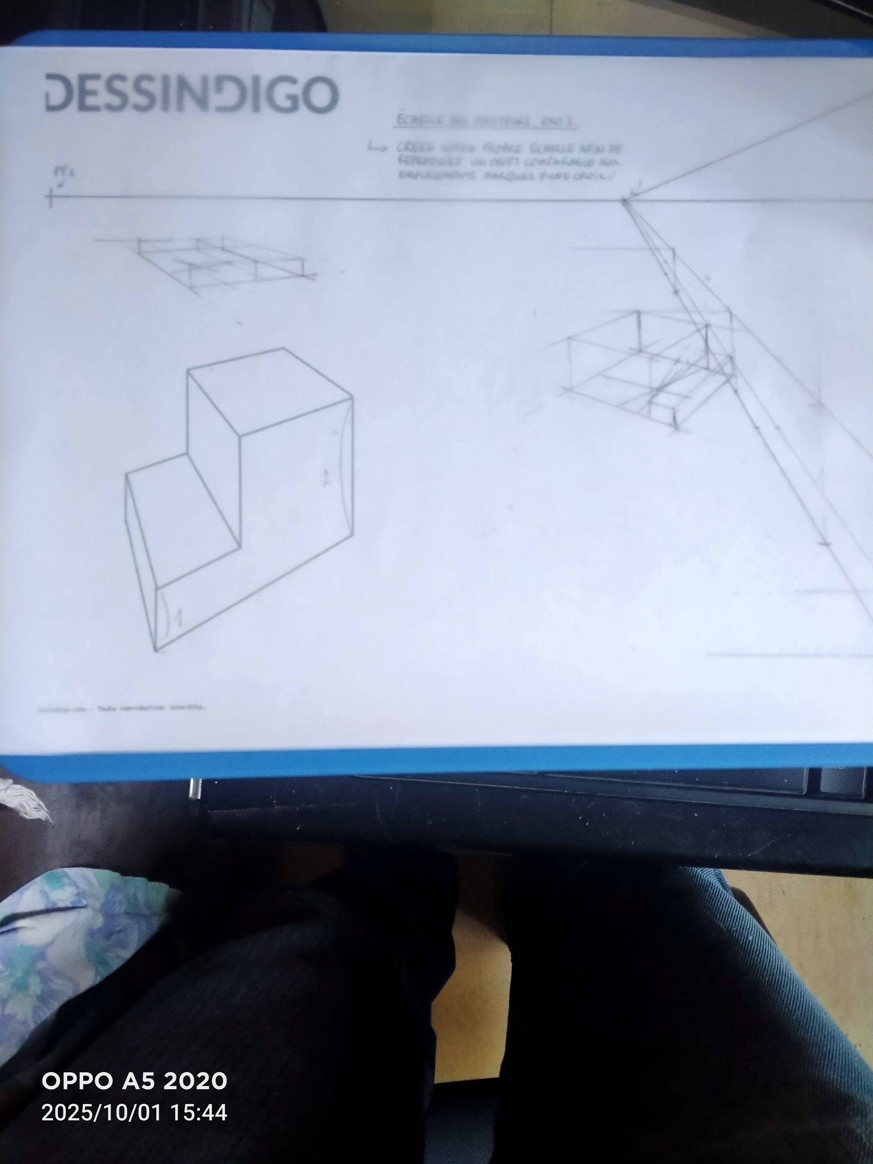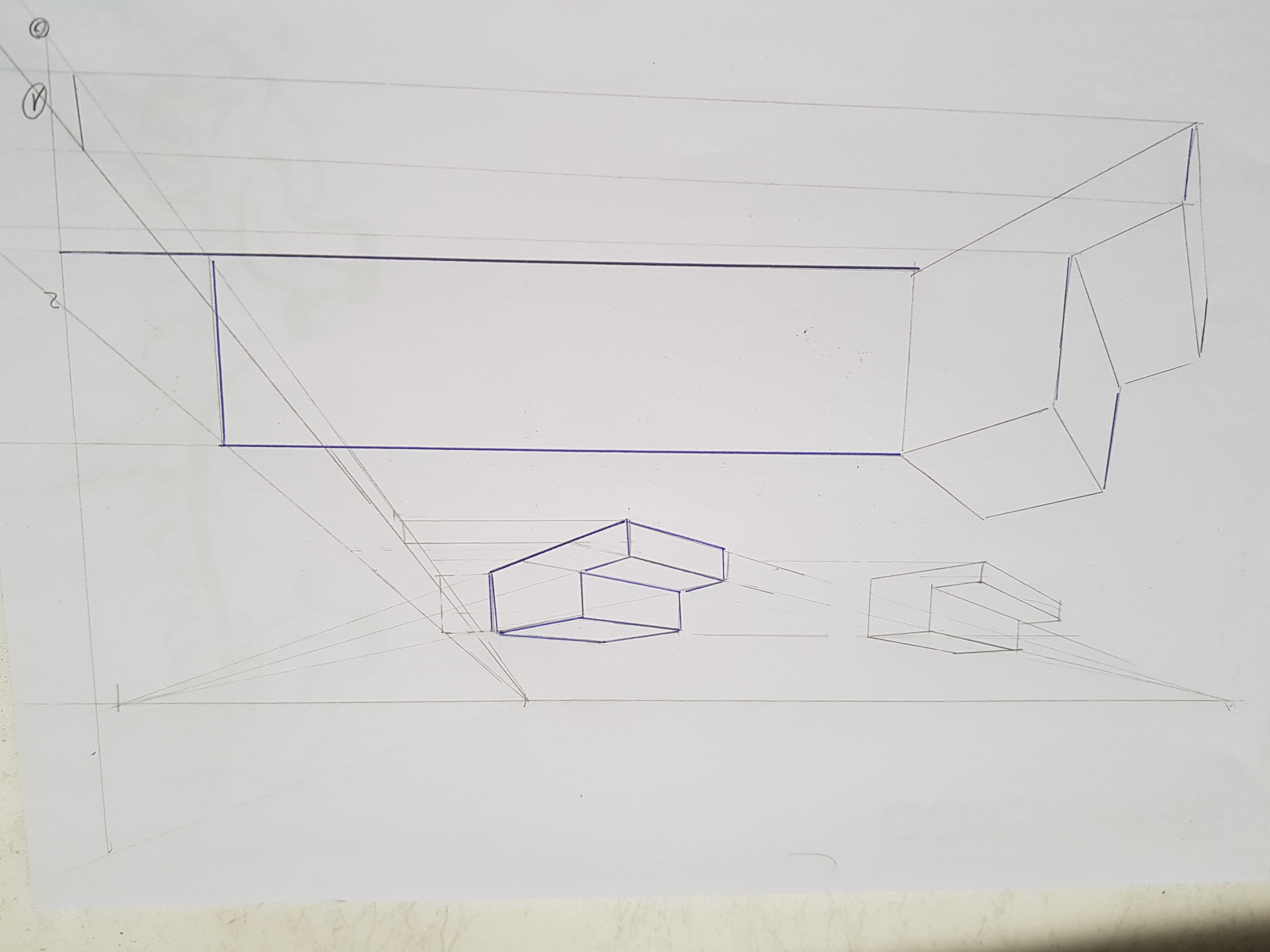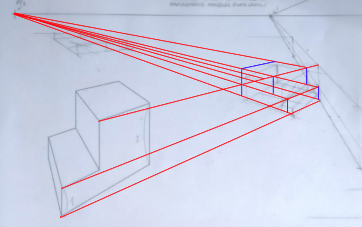 Tu vas connecter chaque coin du modèle avec le guide situé sur le côté, puis tu projetteras des lignes à partir du point de fuite. De cette façon, tu pourras utiliser les intersections pour recréer l'image. J'ai vu d'autres de tes exercices et je sais que si tu réessayes, tu vas y arriver. Alors, bon courage !