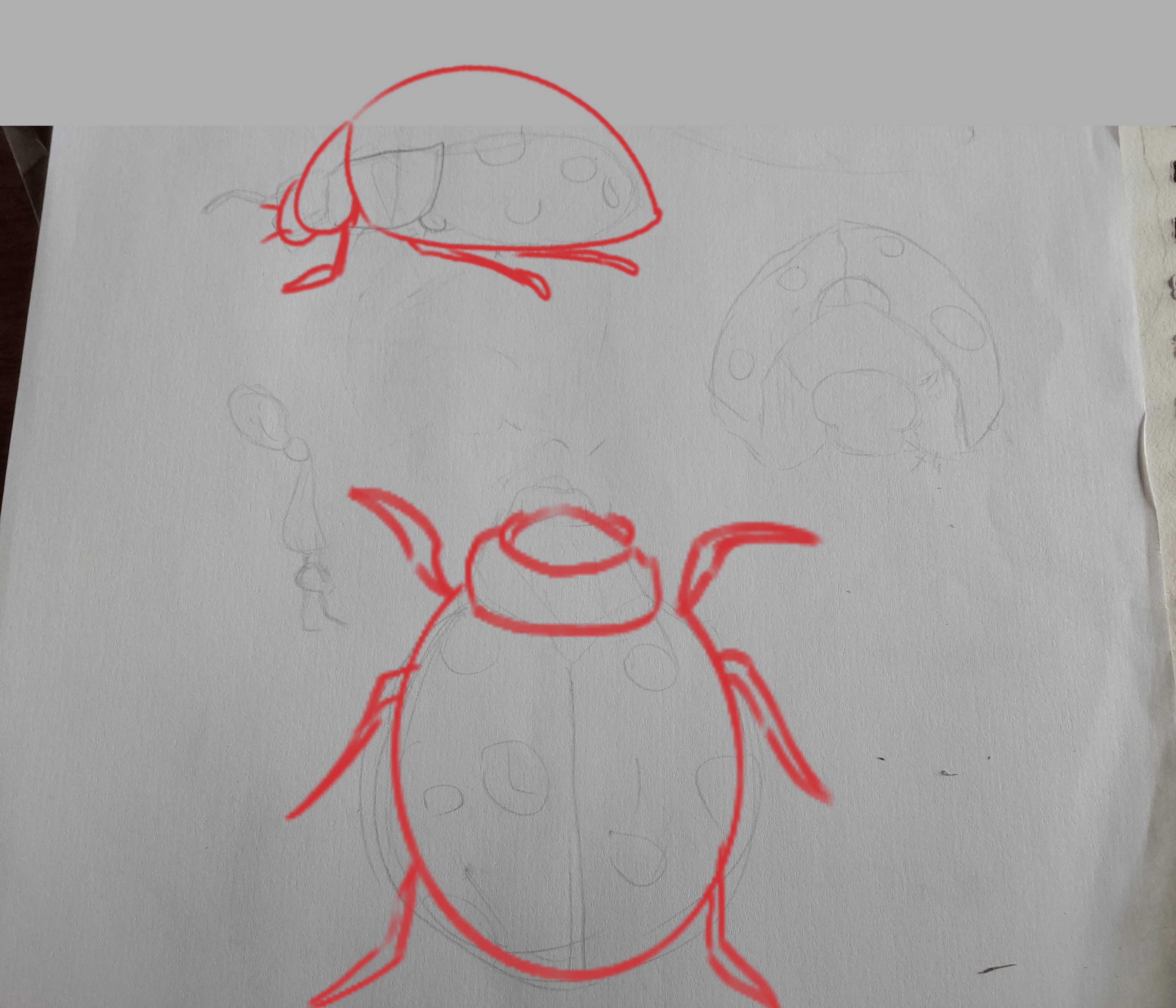Je me suis donc essayé à l'exercice avec la référence sur la coccinelle. Pour le coup, je suis assez mitigé car j'ai plus l'impression que ça a la forme d'une sorte de puceron. J'ai peut-être une idée d'où ça vient avec le manque de rondeur au niveau des ailes sans oublier la tête et le buste qui sont trop grands. Mes traits sont toujours pas encore au top du top mais je vais travailler pour les améliorer. (Merci pour le conseil précédent sur l'exercice des traits/cercles à main levée pour la tablette graphique 😊).