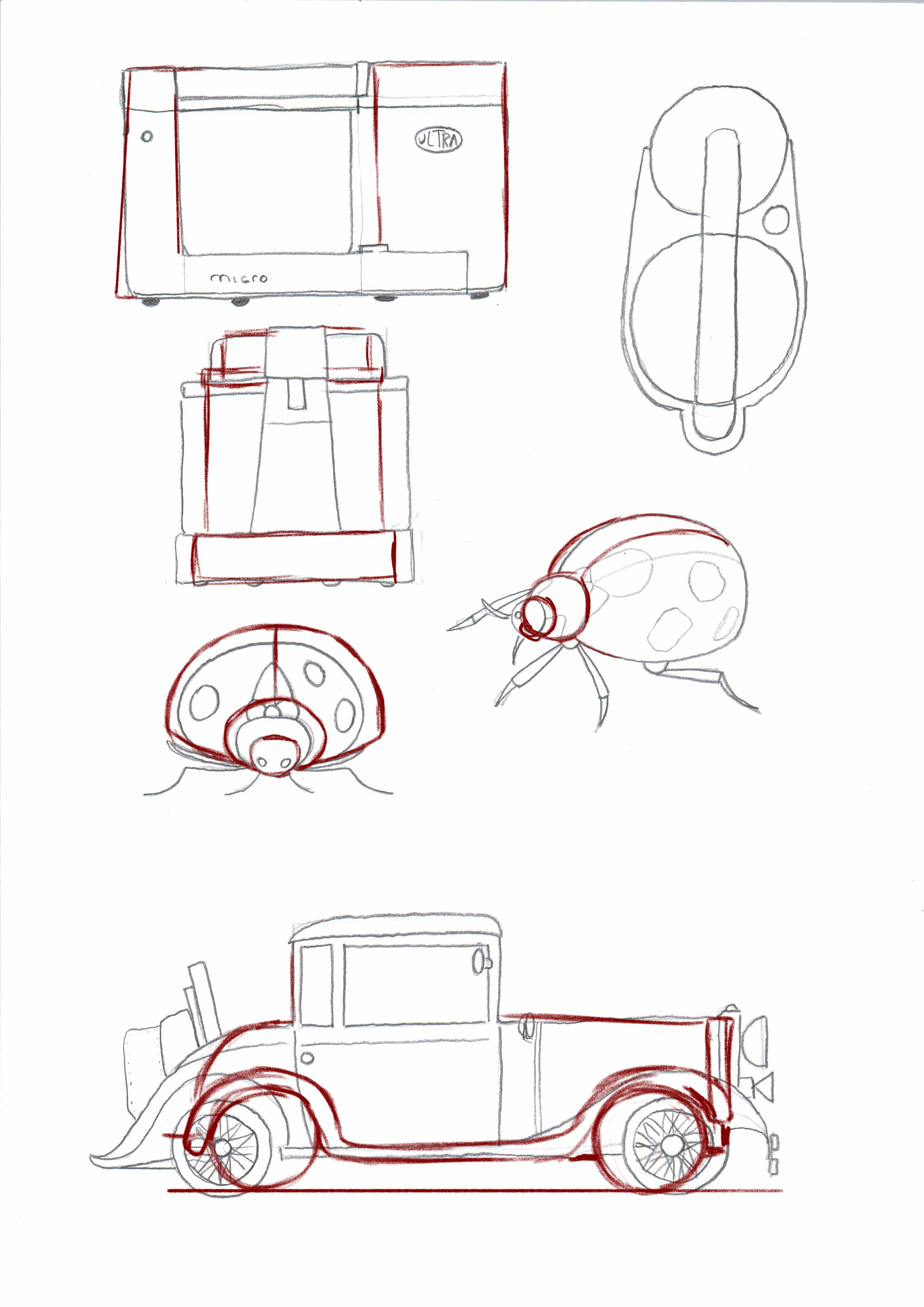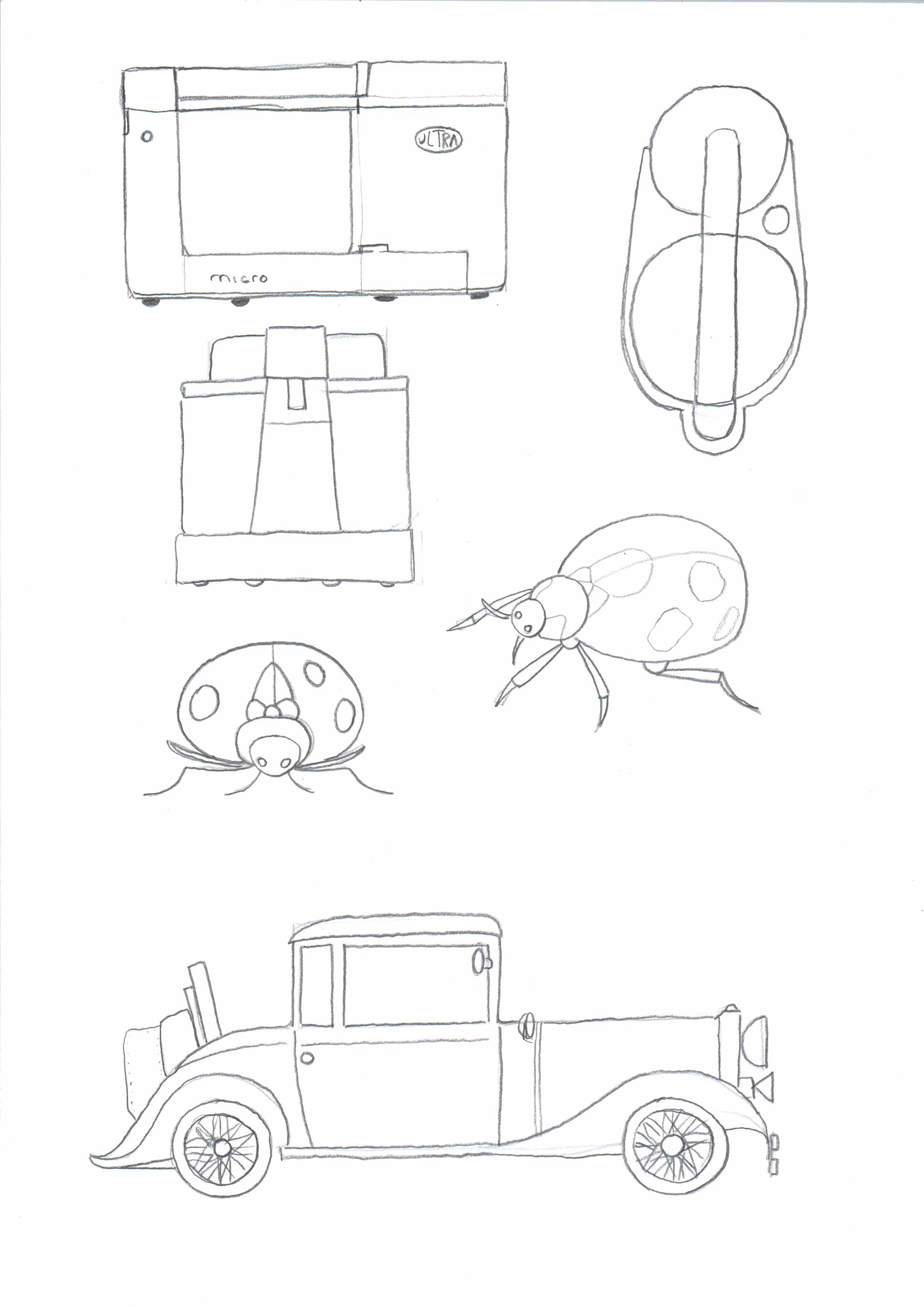 Le plus difficile pour moi a été de dessiner deux roues identiques pour la voiture, de trouver le bon équilibre des pattes de la coccinelle pour qu'elle reste crédible à tenir "sur pattes" et de trouver les bonnes proportions pour le Micro de chez Ultra.