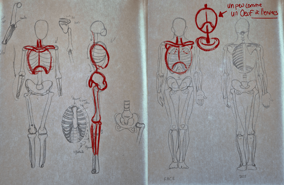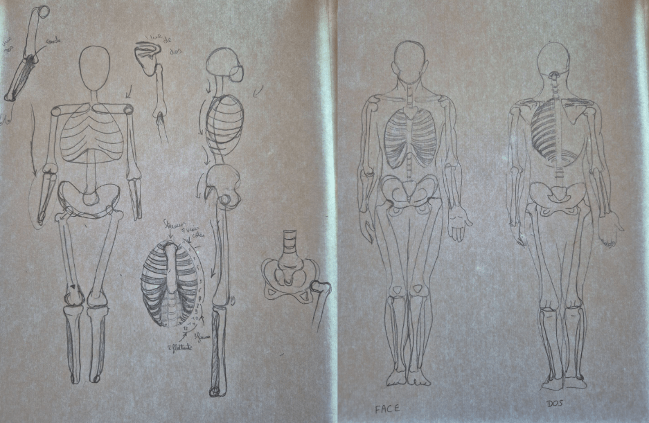 Voici ma version du squelette vu de dos. Il a pris un peu d'embonpoint par rapport au modèle. J'ai essayé de détailler même si ce n'est pas demandé. Cela me permet de mieux retenir et de m'améliorer. Je vais me mettre au profil.