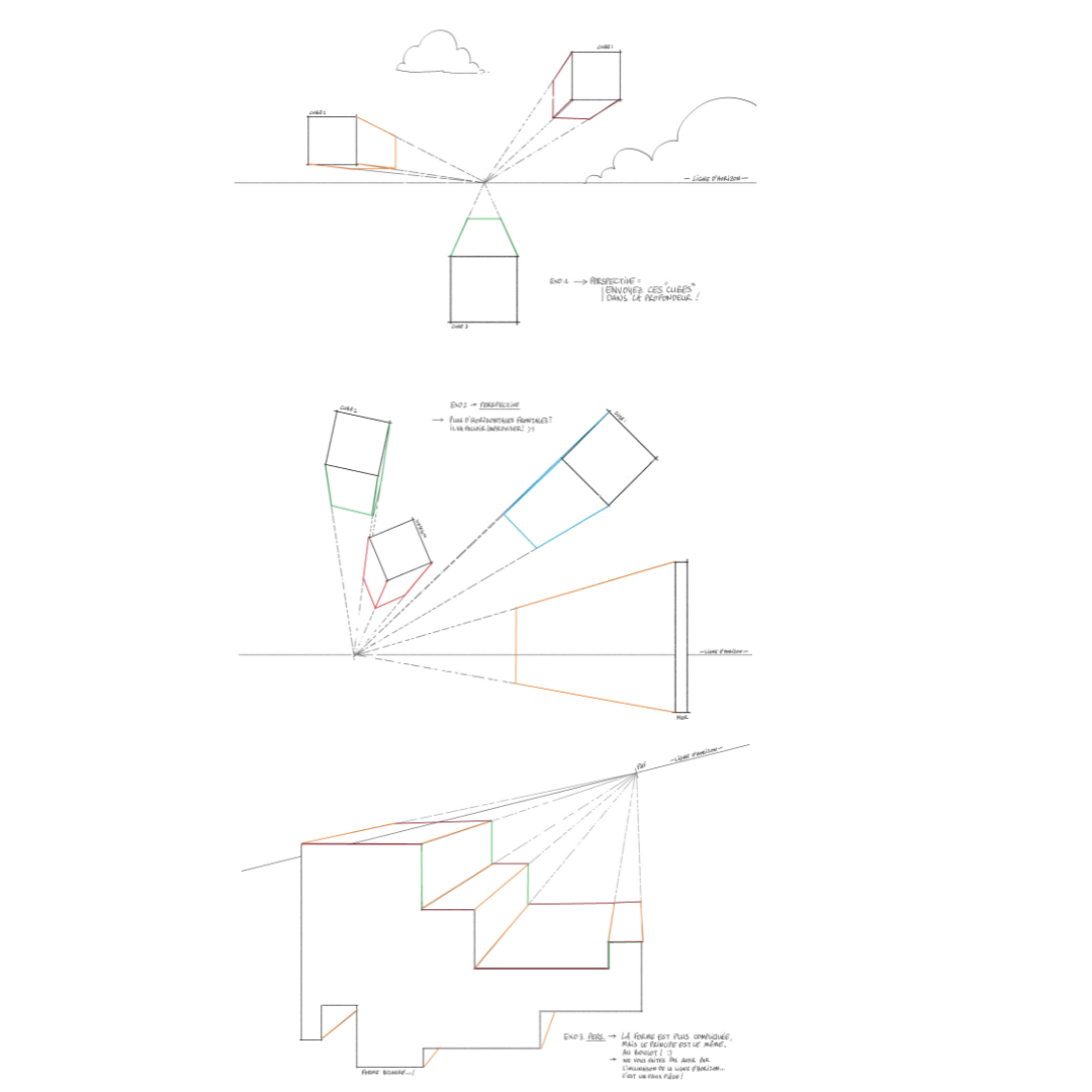 Je partage avec toi une version corrigée de ton exercice. Observe les lignes de fuite et comment tu crées le volume avec des lignes droites.