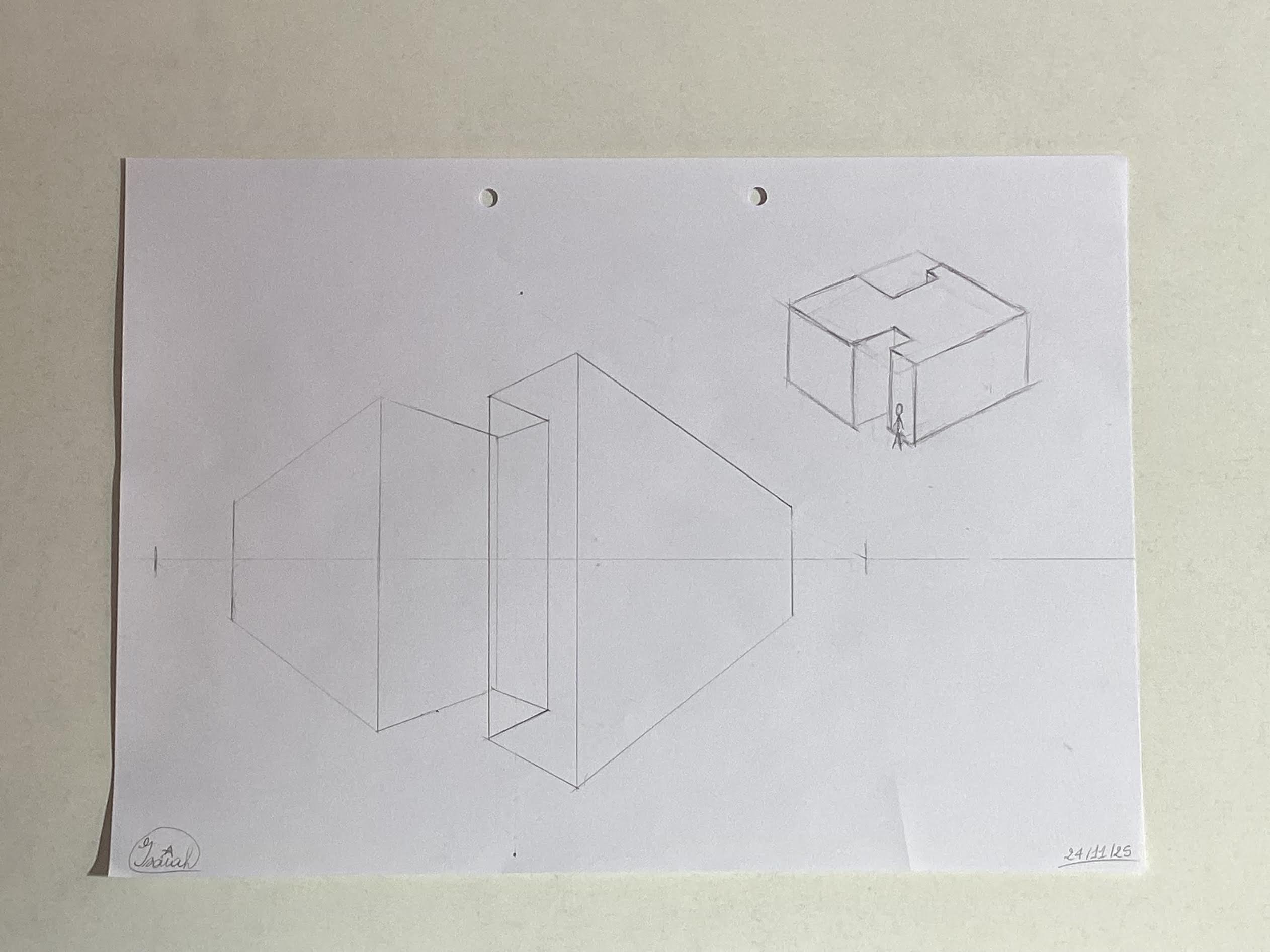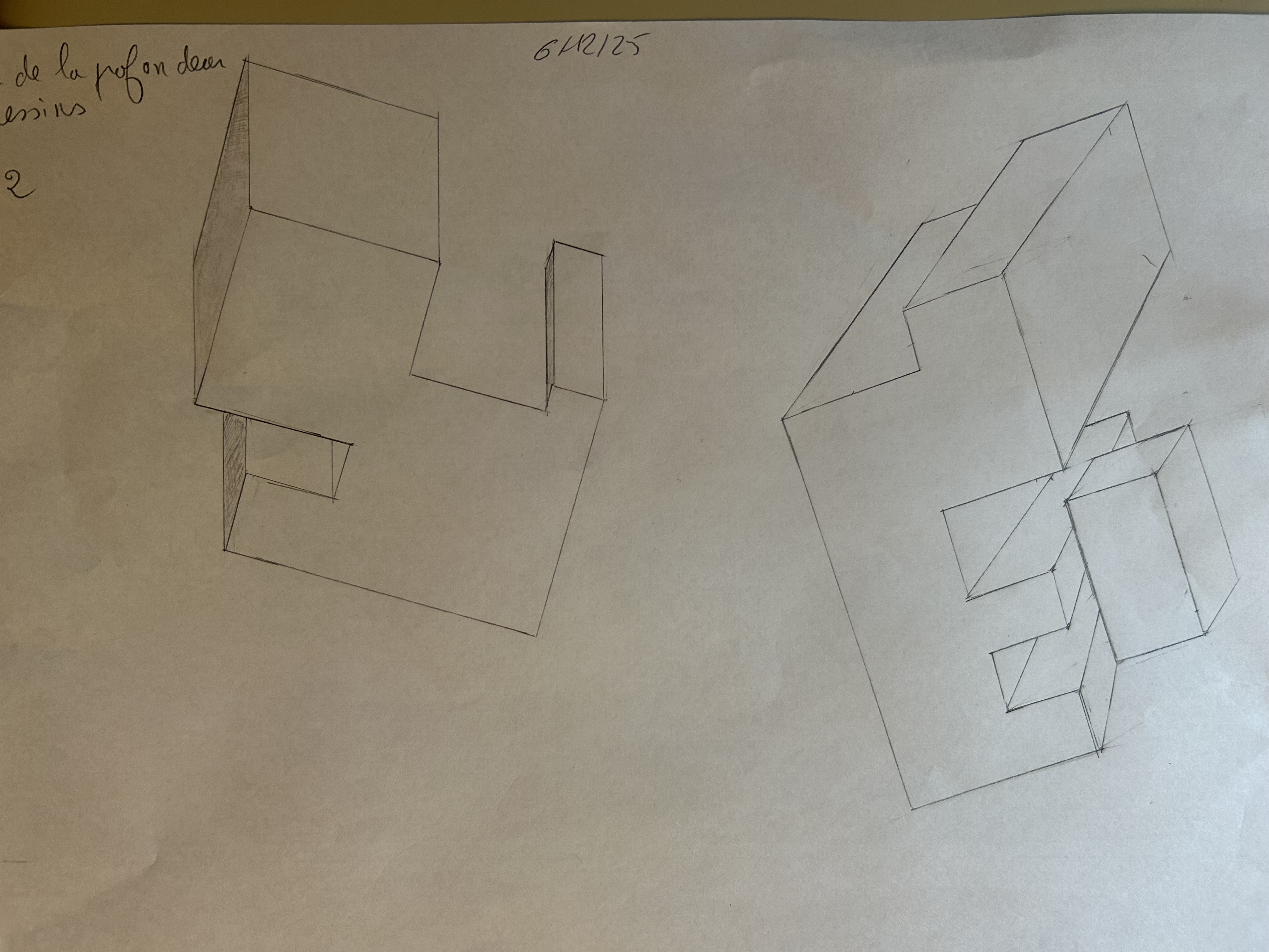 Bonjour, voici mon 2e exercice (le point de vue est celui du bonhomme dessiné sur la version en perspective cavalière) 😀