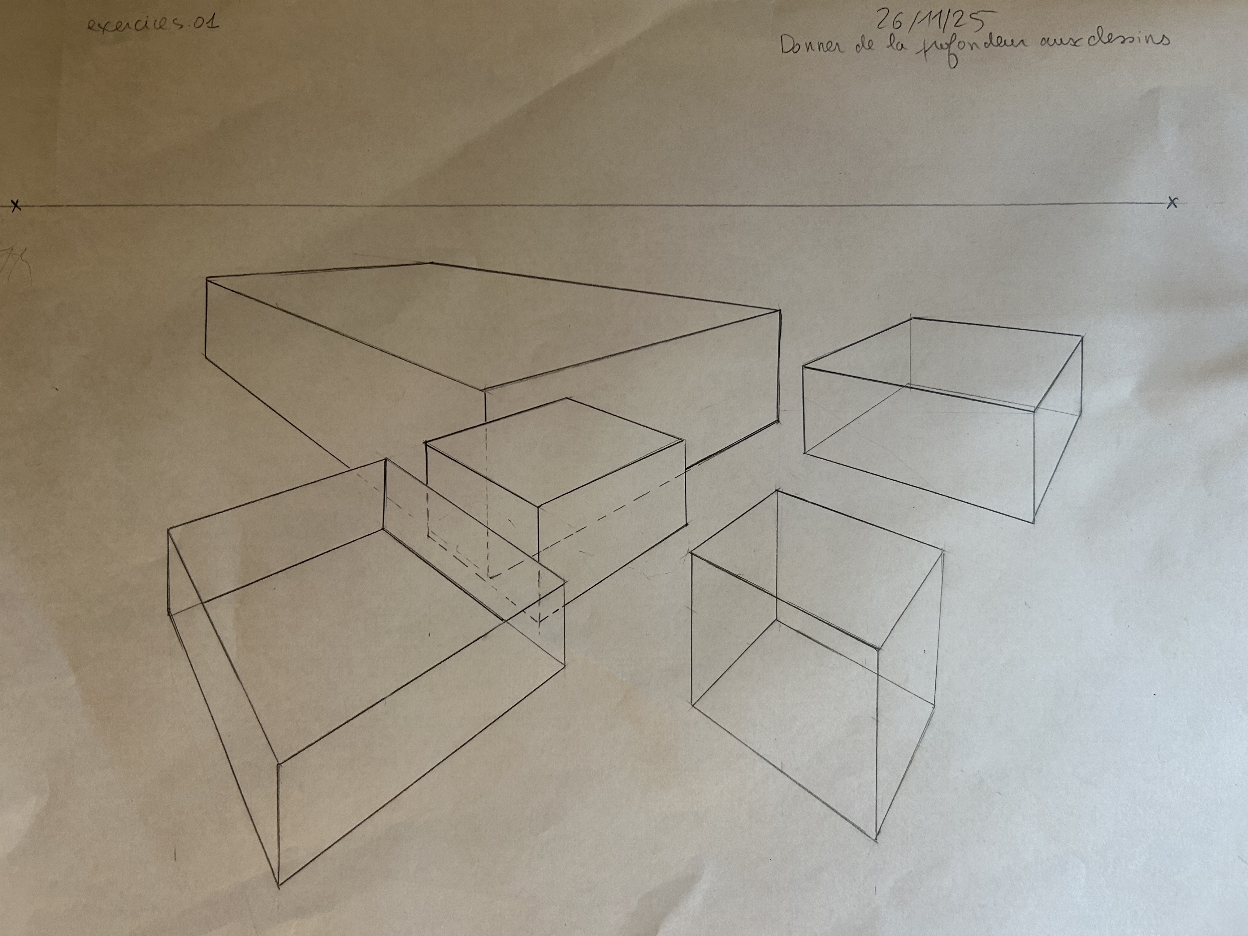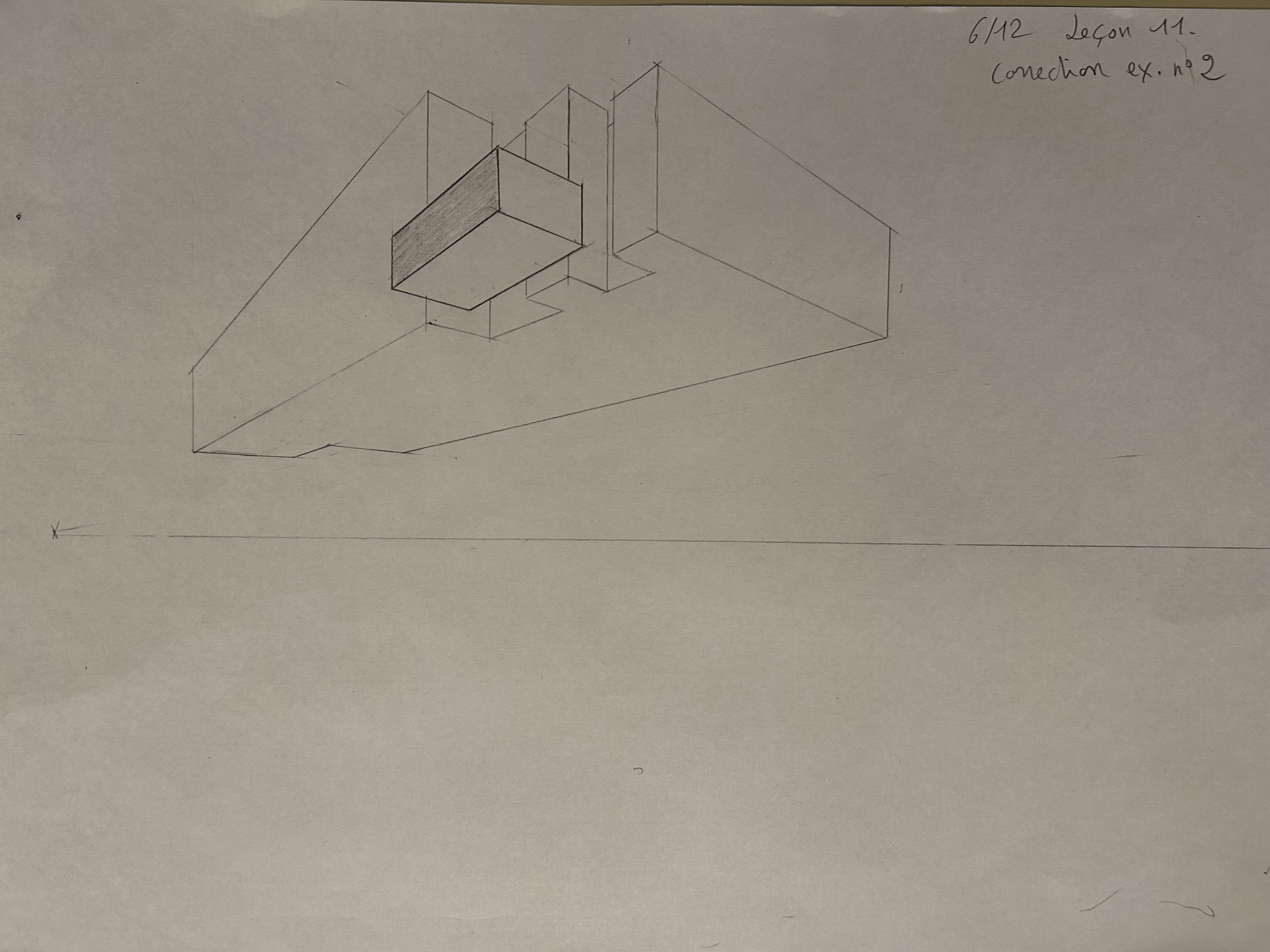 Le deuxième exercice fait aujourd'hui m'a posé quelques problèmes. Je n'arrivais pas à trouver un point de fuite. J'ai dessiné un peu à l'intuition. Il va falloir que je revisionne ce cours.