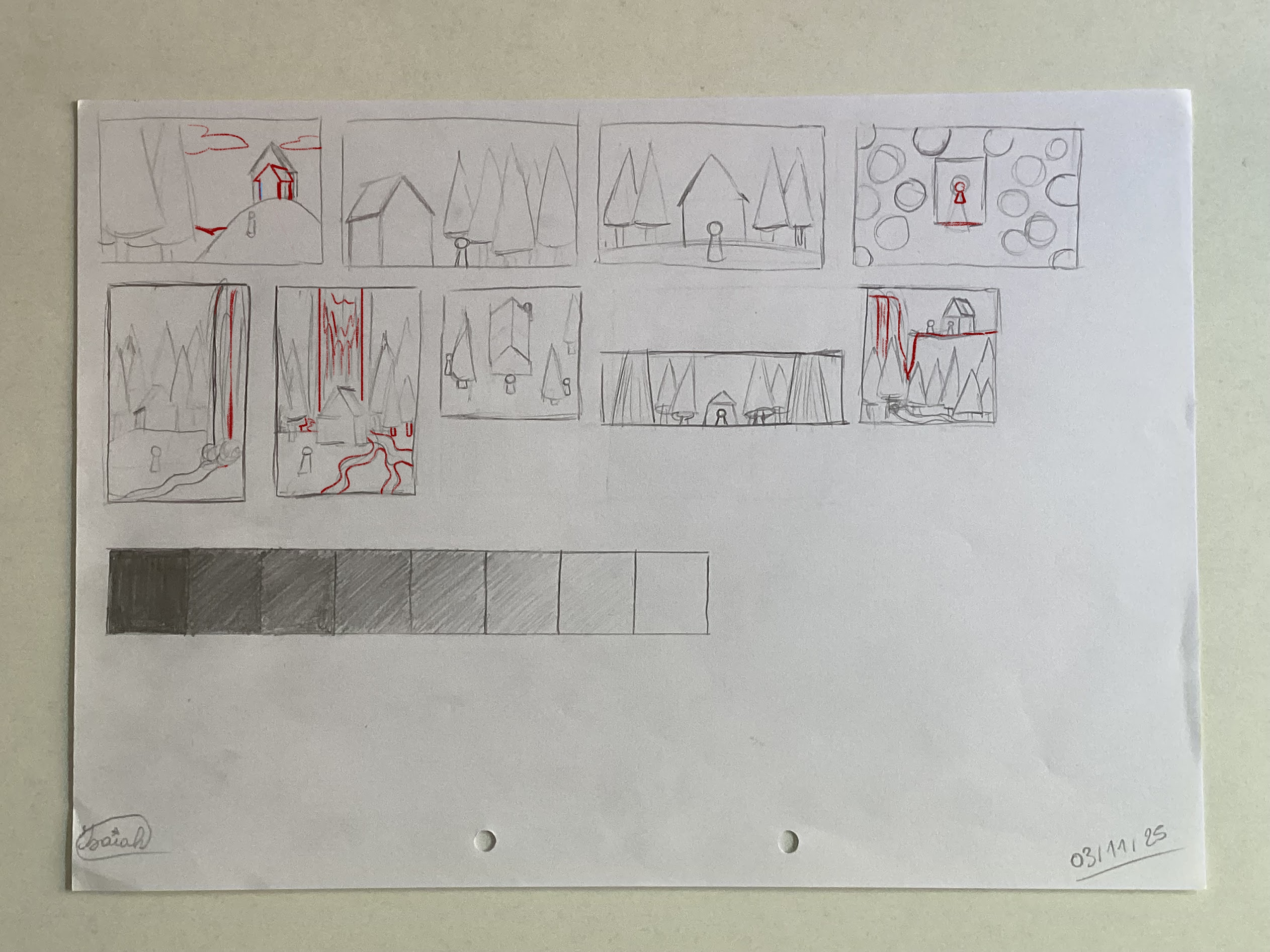 Tu as trois scènes très simples mais très bien composées. La perspective est bien définie, ce qui crée des angles très cinématographiques. D'autre part, je tiens à souligner l'utilisation de différentes valeurs de ligne pour hiérarchiser l'attention portée aux objets. Cela enrichit beaucoup la lecture du spectateur.