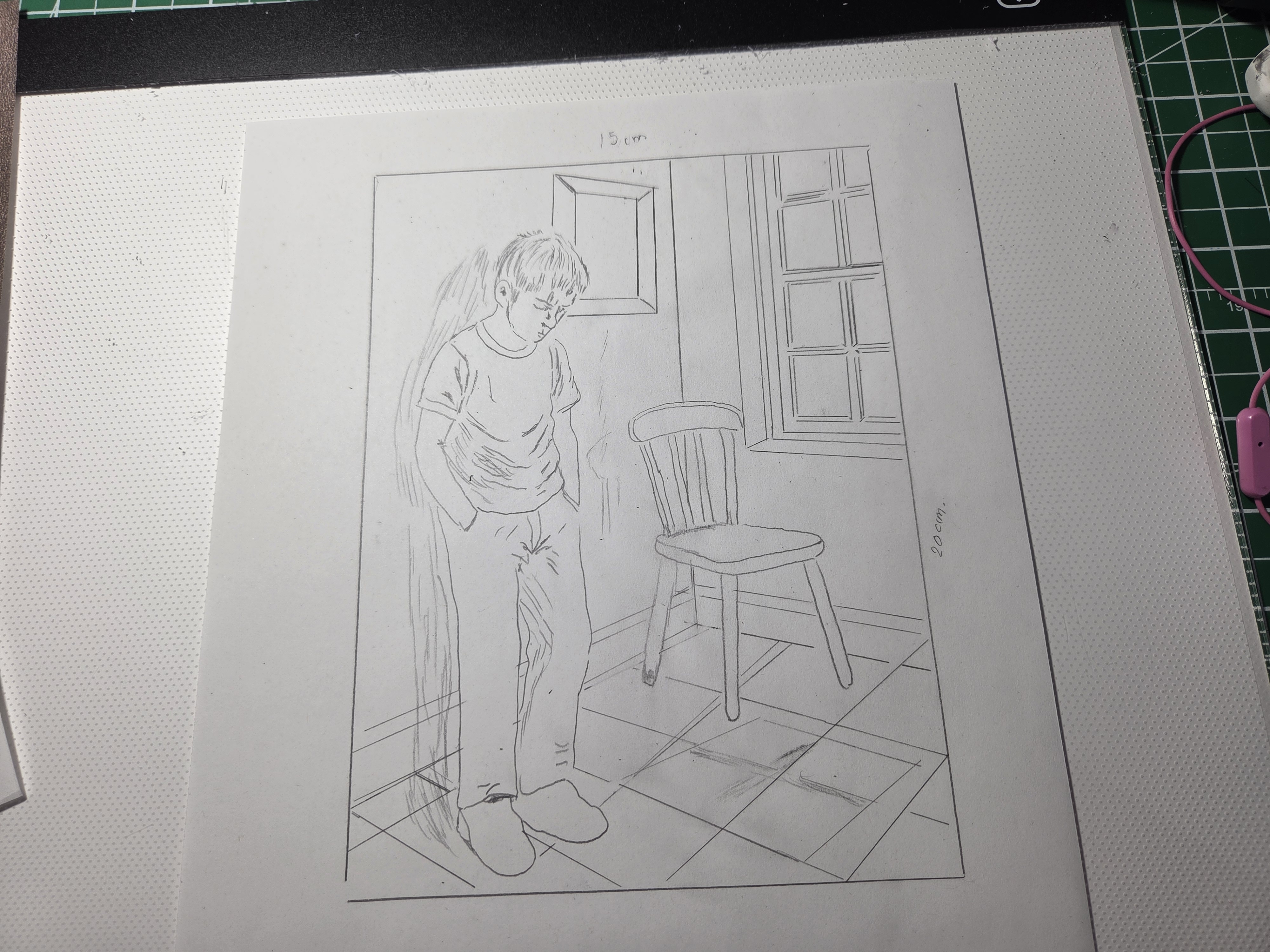 J'espere que vous allez bien ! Me voila de retour avec le 1er jet de ce dessin, vous ne voyez pas la fin des mes dalles car ça ne passait pas dans l'imprimante mais je me suis dit que ce n'était pas le plus important, le point de fuite de gauche n'est pas sur l'image mais des lignes de fuites sont tracés. De même, il manque un bout de pied au perso 🙃 !
