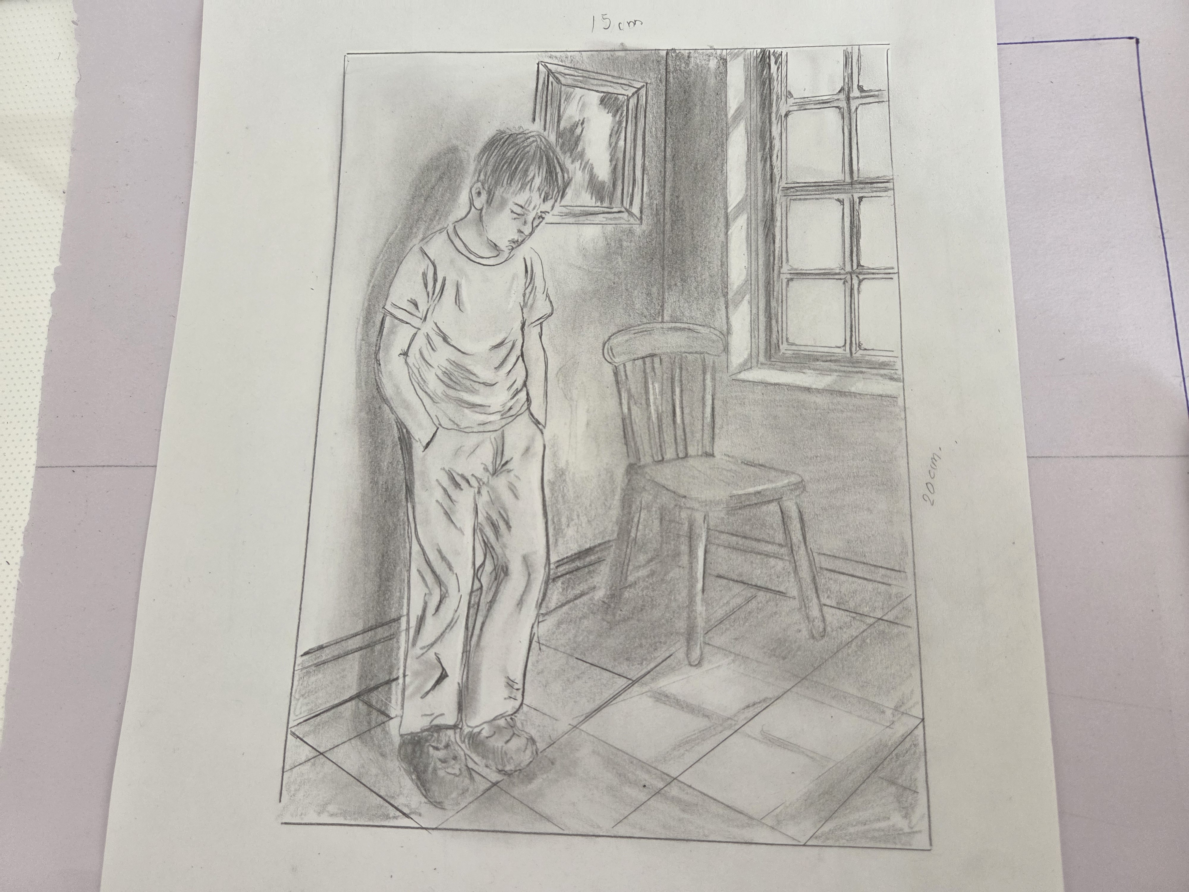 Tu as fait un très beau dessin avec une composition très pertinente. Même s'il y a beaucoup d'espace apparemment vide, le regard du personnage le remplit et nous invite à partager ses réflexions.