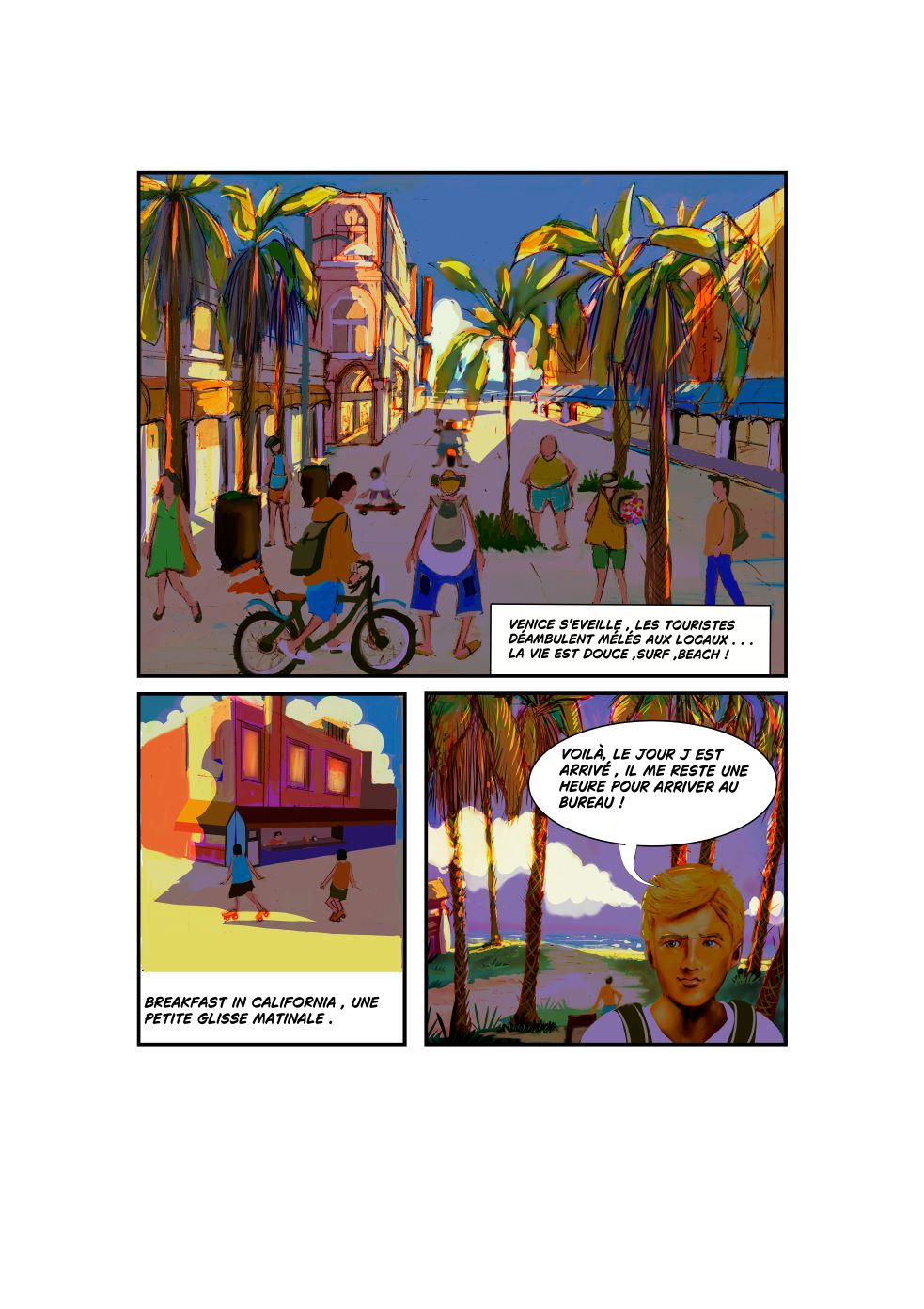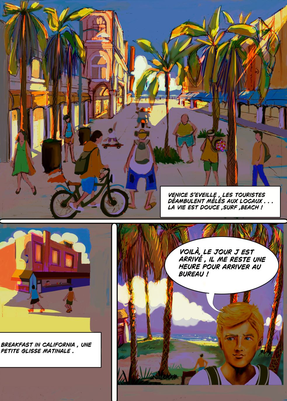 Quant à la technique, je trouve ton style super agréable. Les couleurs intenses sont appropriées pour le décor et le moment ; tu pourras varier cela dans tes prochaines vignettes pour nous rapprocher de l'émotion de l'instant.
