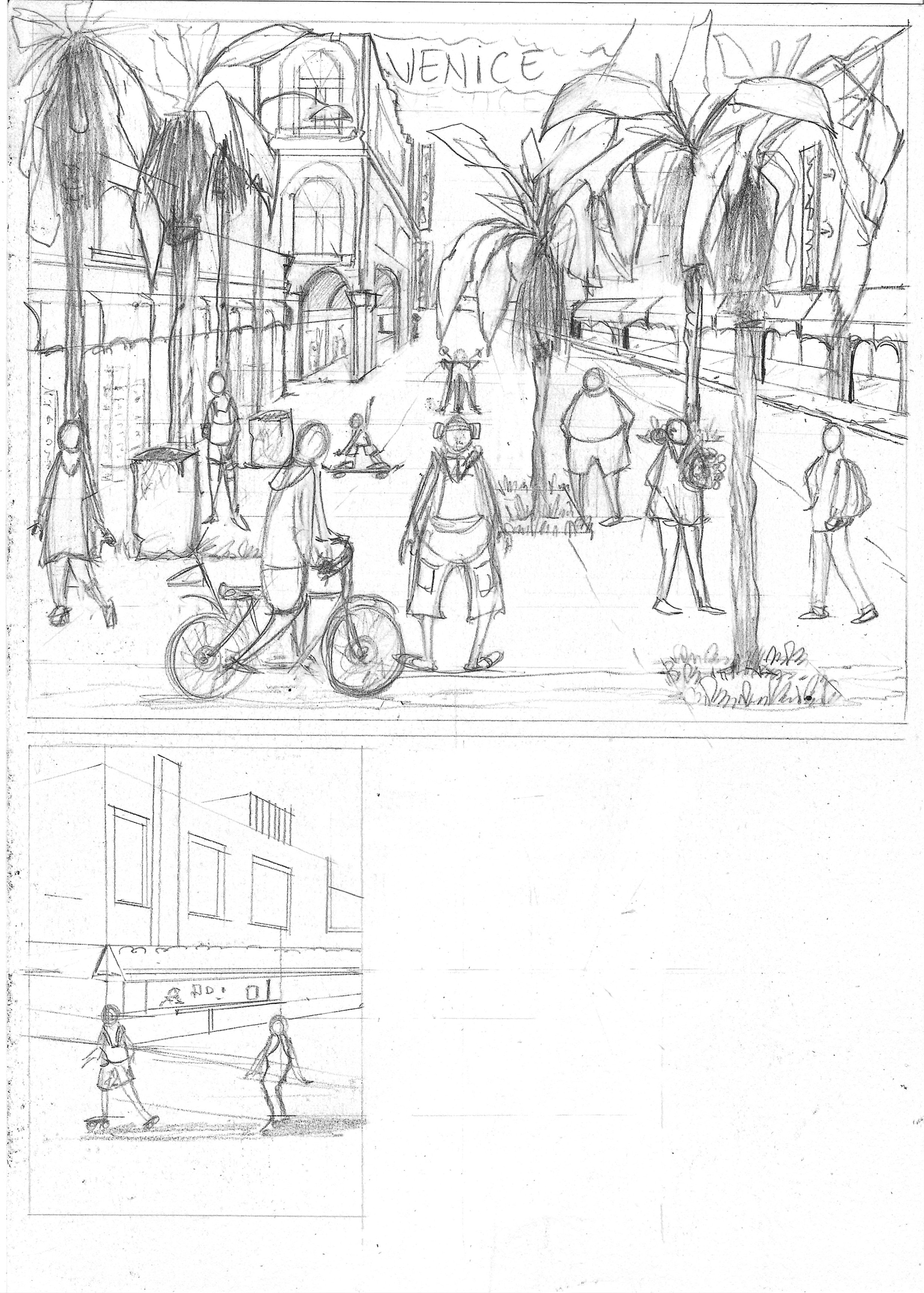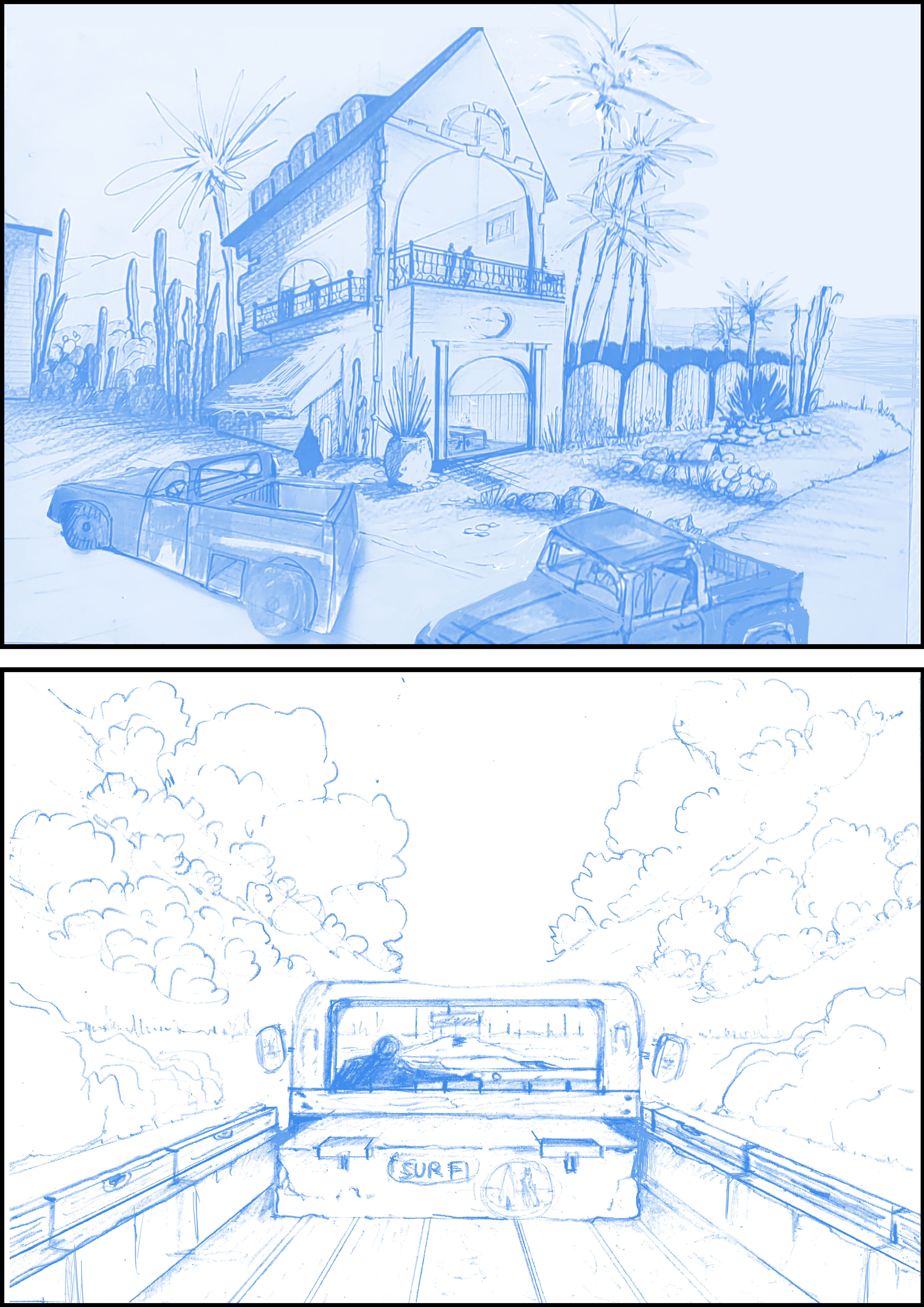 J'aurais une vue départ de la maison du jeune et arrivée dans un pickup sur Los Angeles , j'ai juste fait les croquis pour ces scénes