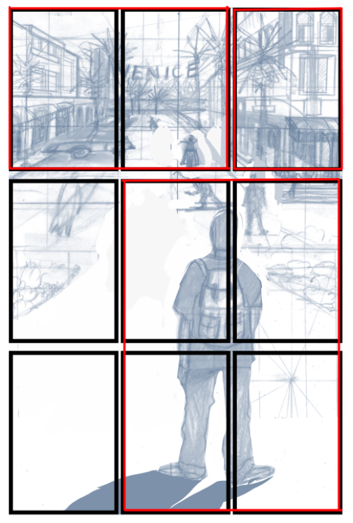 Je te suggère la répartition suivante : la taille des cases nous renseigne également sur l'importance de l'événement dans la narration générale, et elle peut varier selon tes envies.
