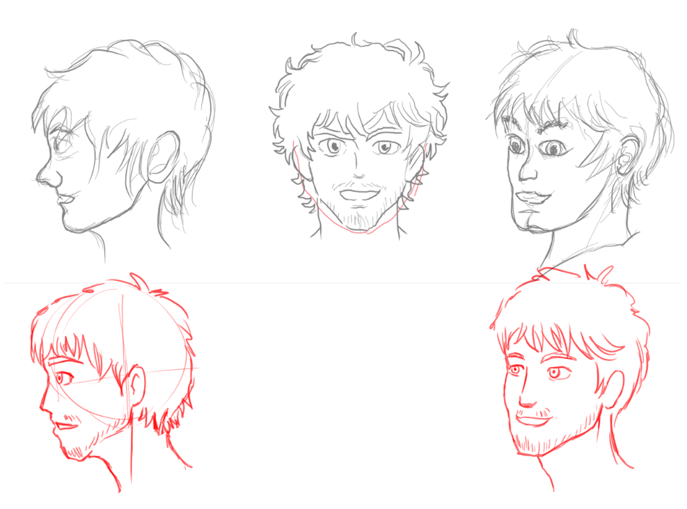 Je partage avec toi un ajustement de ton exercice. J'ai effectué quelques changements sur les visages de profil et de trois-quarts pour qu'ils correspondent mieux à la vue de face. Observe et compare, s'il te plaît.