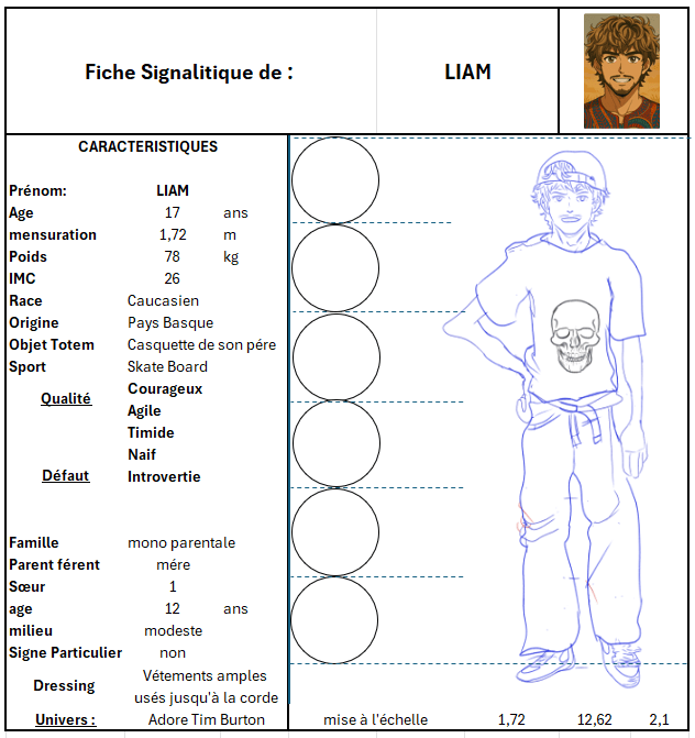 Pour les besoins de ma BD j'ai du crée une fiche signalitique qui servira de base aux archives de l'écoles .J'en ai profité pour que cela puisse me servir à la construction de mes personnages .Comme c'est mon personnage principal il va me servir d'étalon pour définir les autres personnages.