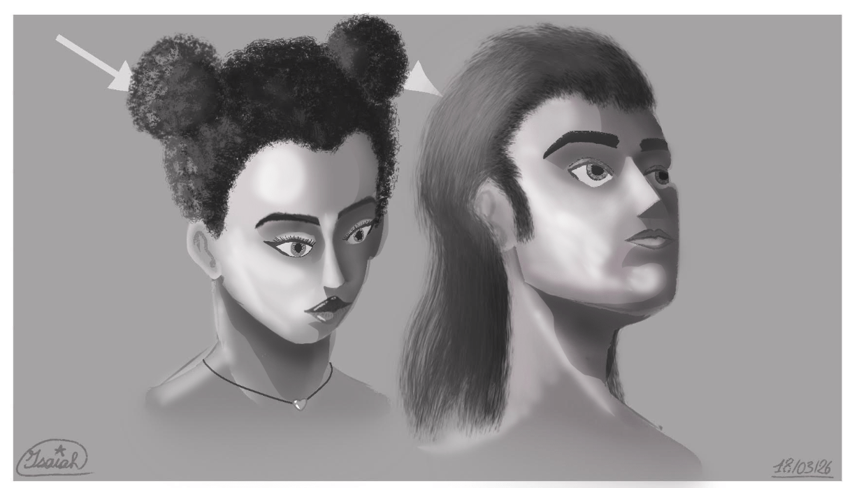 D'abord, en termes de proprtion et de construction du dessin, le personnage de gauche a l'oreille très en arrière par rapport à l'avant du visage et al mâchoire. n'oublies pas, l'oreille rejoint le visage à la moitié de la profondeur du crâne, donc je vais l'avancer, ainsi que l'implantation des cheveux. ça me dérange moins avec le second personnage car ses yeux, nez et bouche sont davantage vers la gauche, comme s'il était davantage tourné vers nous.