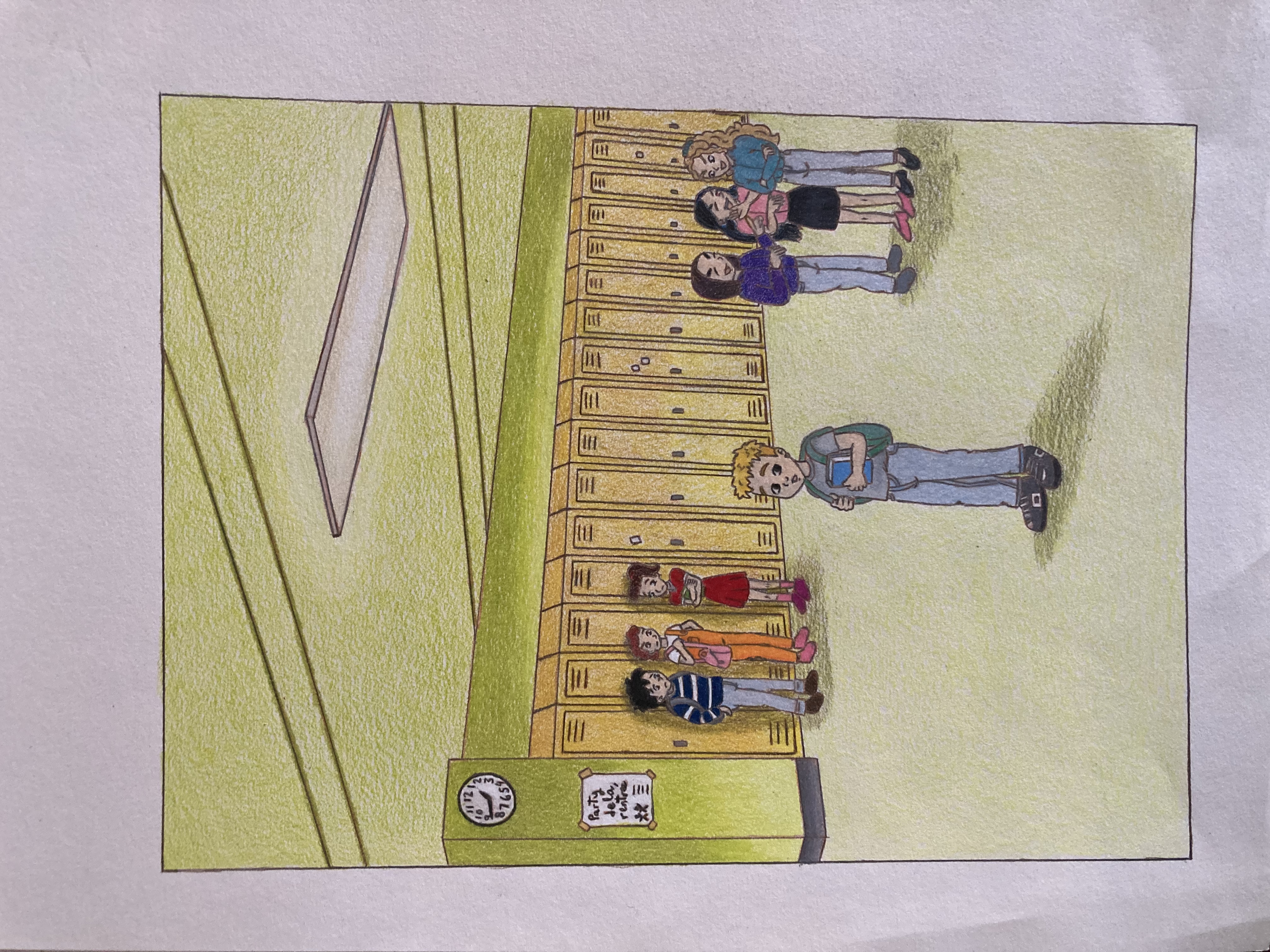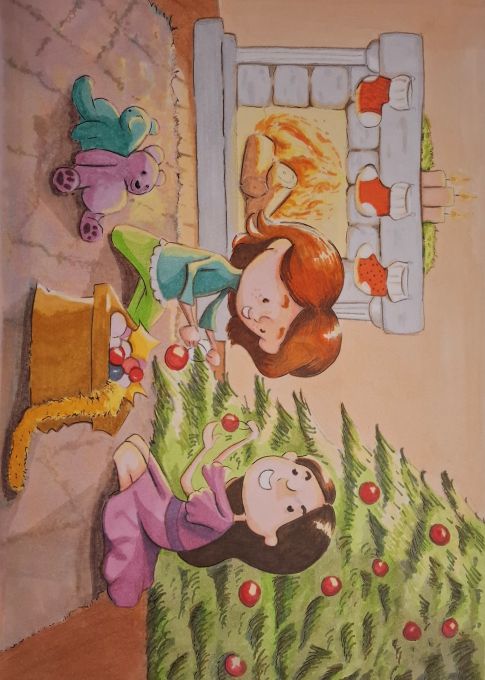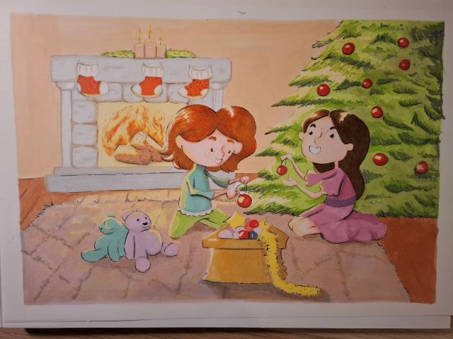 J'ai apporté quelque modification par rapport à mon dessin de base. J'ai rapproché les éléments entre eux, j'ai pensé que ça ferait moins éparpier et que la scène serait plus cosy. Pour la couleur, j'ai essayé de donner un côté chaleureux mais la mise en couleur et quelque chose que j'ai réelement beaucoup de peine à faire. Dans l'ensemble je suis étonnée du rendu parce que j'y croyais pas réelement quand j'ai commencé.