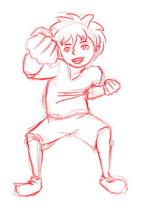 Je te partage une interprétation, j'espère que cette référence pourra orienter le dessin de ton personnage. Comme tu débutes, je te recommande de toujours chercher des références pour tes postures : tu peux prendre des photos de toi-même avec la posture et la perspective exactes que tu souhaites, et dessiner à partir de là.