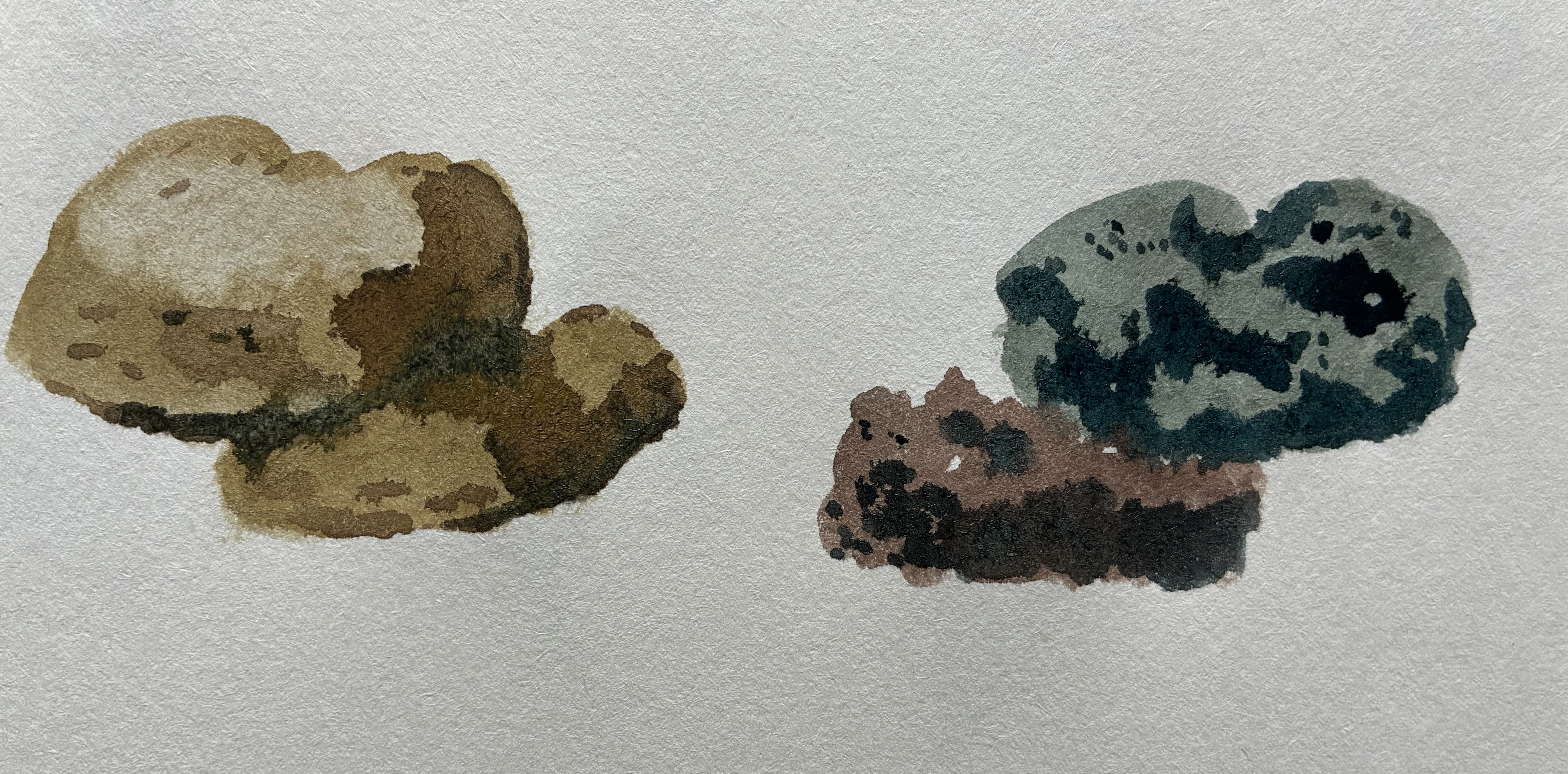 Tu as réussi à donner de la texture à ces rochers, bien joué ! Si tu souhaites ajouter de l'éclat, tu peux appliquer un peu de gouache ou laisser des espaces blancs dès le début, en évitant de peindre sur ces zones.