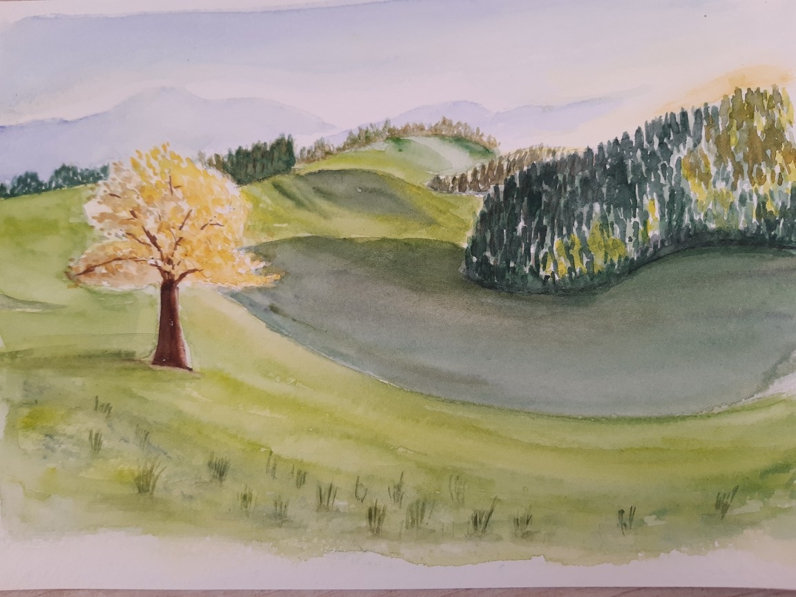 je suis assez contente de l'ensemble, (même si mon aquarelle est plus lumineuse que la photo, le jaune-vert surtout),