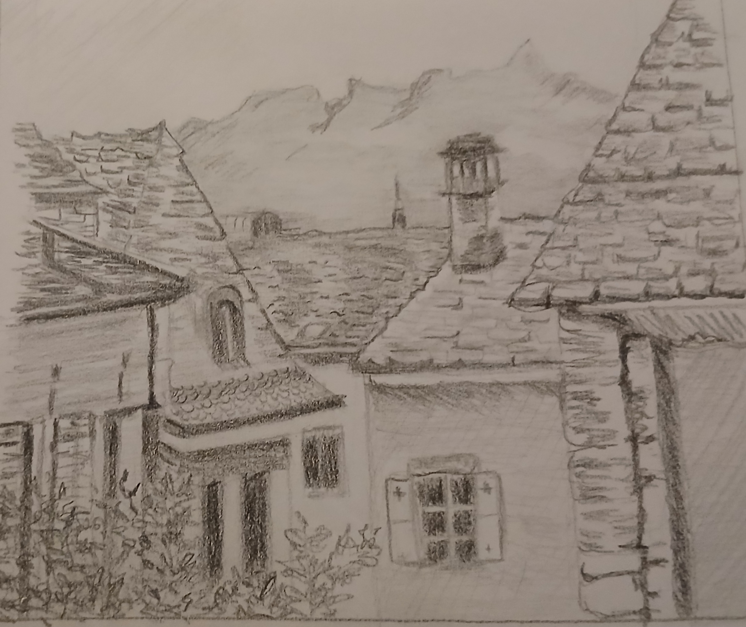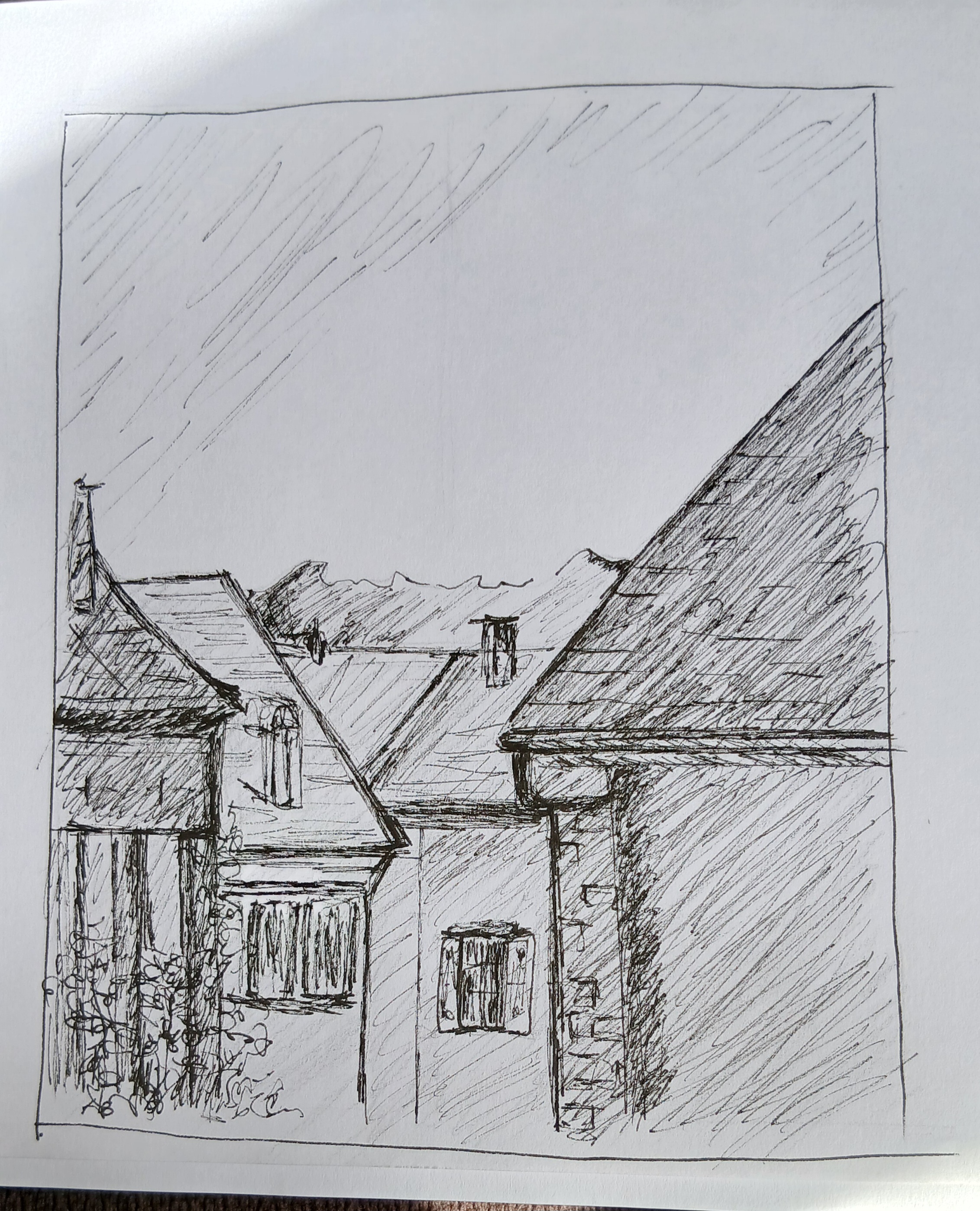 Combiner l'encre avec quelques ombres au graphite donne à ton dessin de la solidité et de l'atmosphère. C'est une excellente option que tu pourrais continuer à explorer.