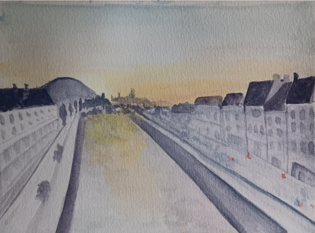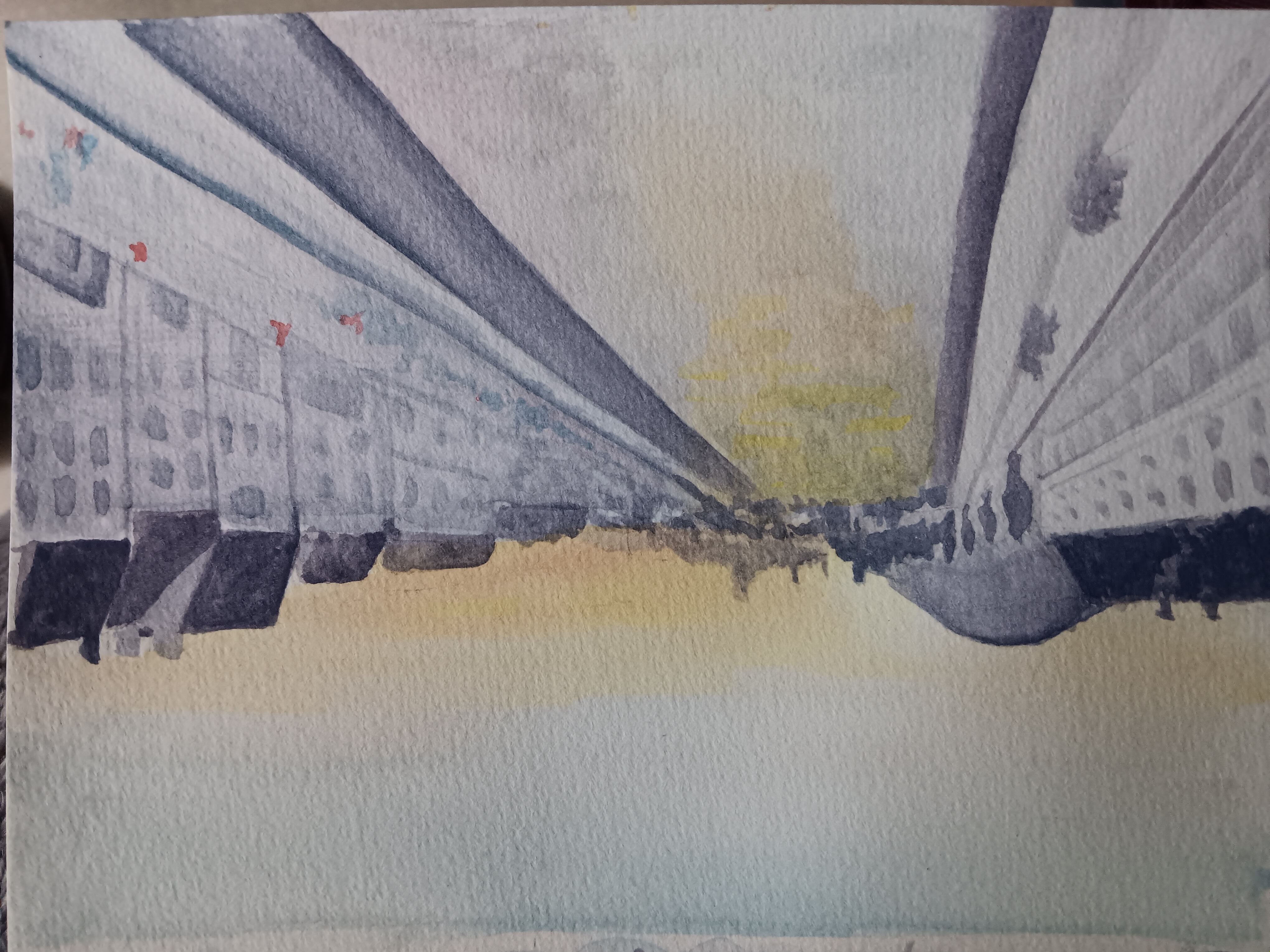 Tes peintures sont très intéressantes. Dans le deuxième rendu, on remarque un dégradé plus doux, qui s'intègre de manière fascinante avec les bâtiments peints de façon monochrome dans des tons de bleu. Bien joué !