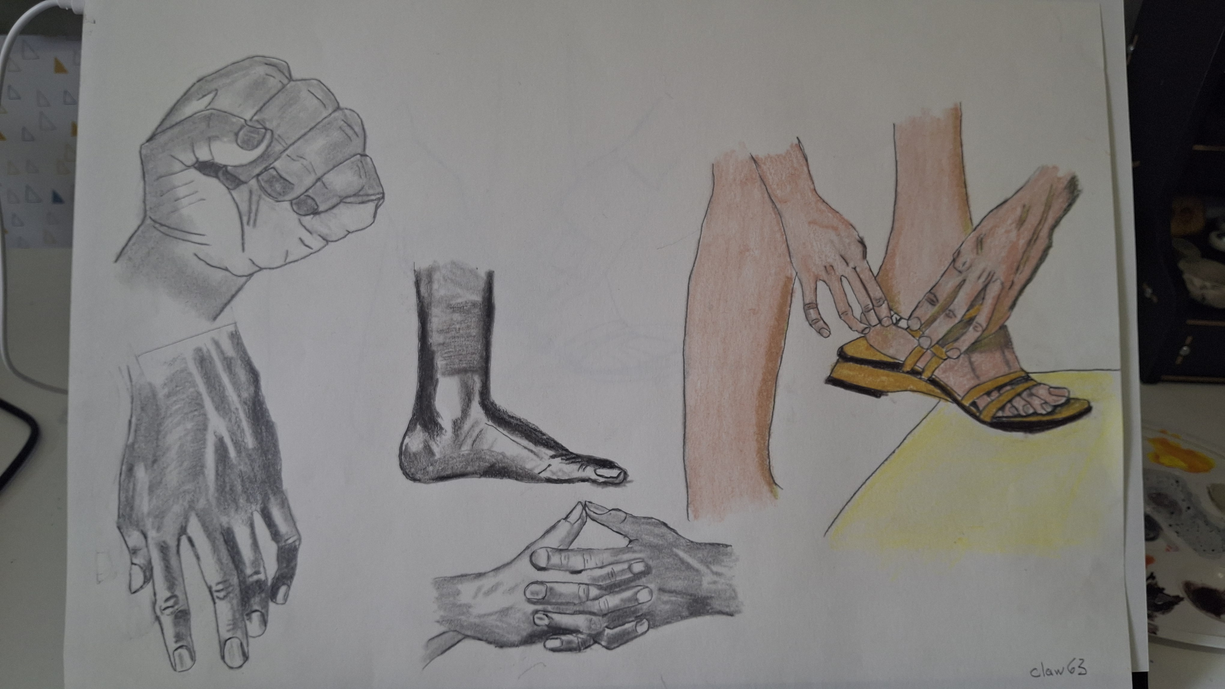 Ces études sont très réussies : tu as capté des détails précis de volume et de proportions sur les mains et les pieds que tu présentes. Si tu souhaites approfondir, réalise des exemples de plus grande taille en dédiant une feuille entière à chaque étude, ce qui te permettra de saisir encore plus de détails.