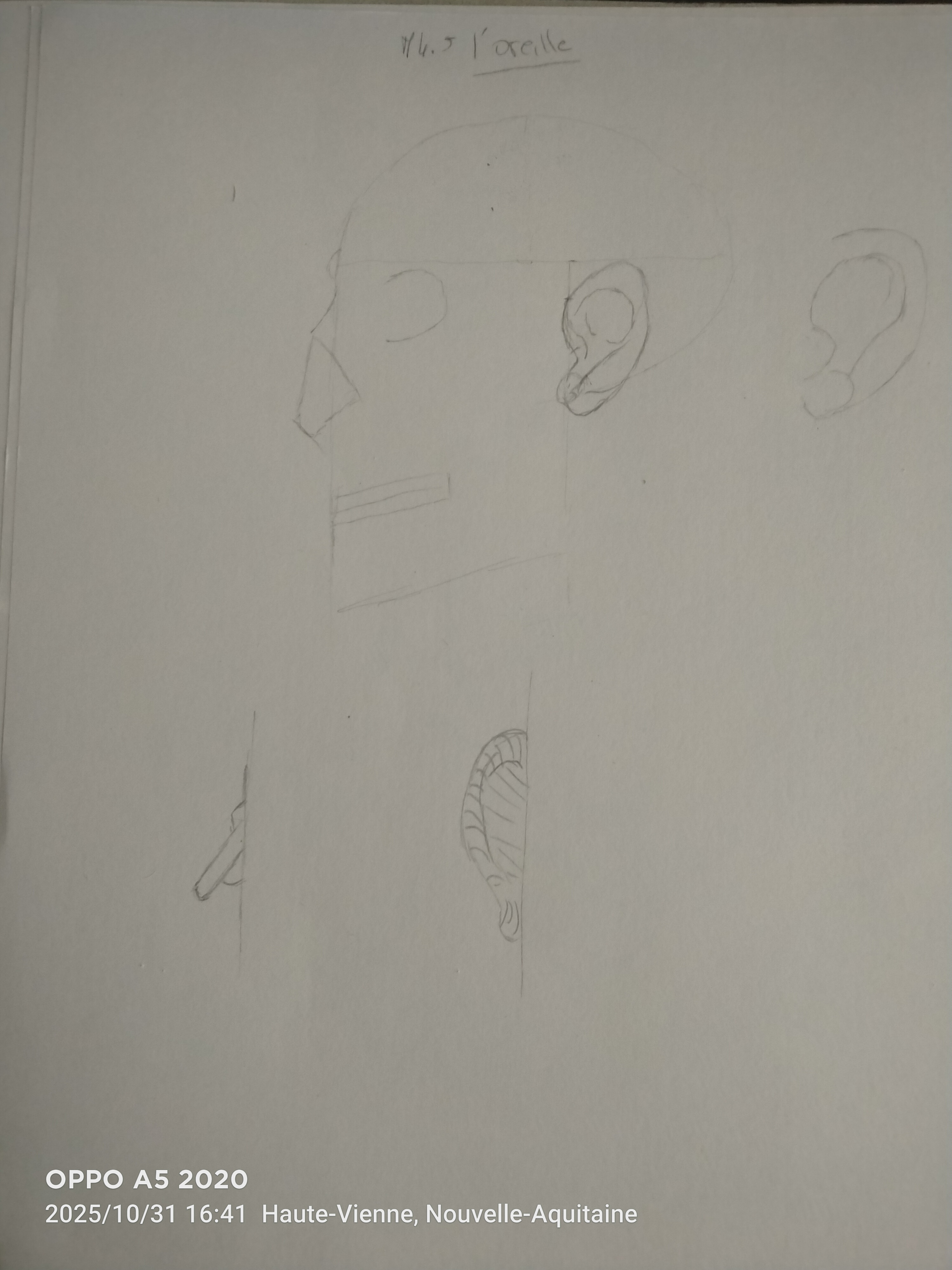Essaye de bien aligner le haut de l'oreille avec les sourcils et le bas avec la base du nez, ainsi tu pourras toujours vérifier que tes proportions tiennent la route (du front aux sourcils, des sourcils à la base du nez et de la base du nez jusqu'au menton). Du reste cherche bien la forme globale sans petit trait "chevelu". Conserve bien la forme globale comme si tu dessinais à l'interieur d'un rectangle dont les bords se reserreraient petit à petit pour épouser les contours de l'oreille.