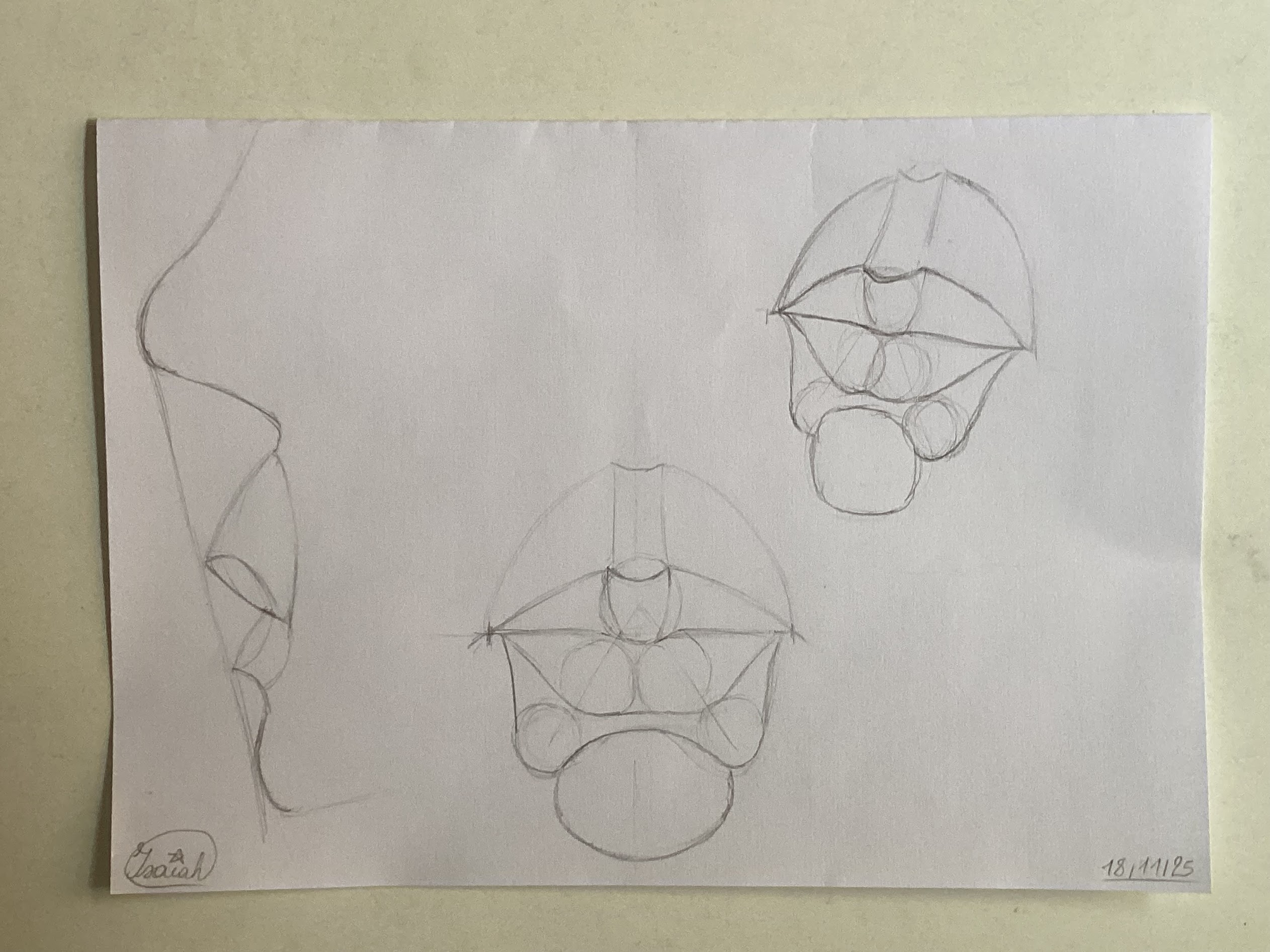 Je te partage quelques corrections pour tes vues de face. S'il te plaît, observe bien l'exemple et n'oublie pas de maintenir les proportions. Par ailleurs, tes croquis de face et de trois quarts sont très bien ! Garde juste à l'esprit que, généralement, la lèvre inférieure est plus large que la lèvre supérieure.