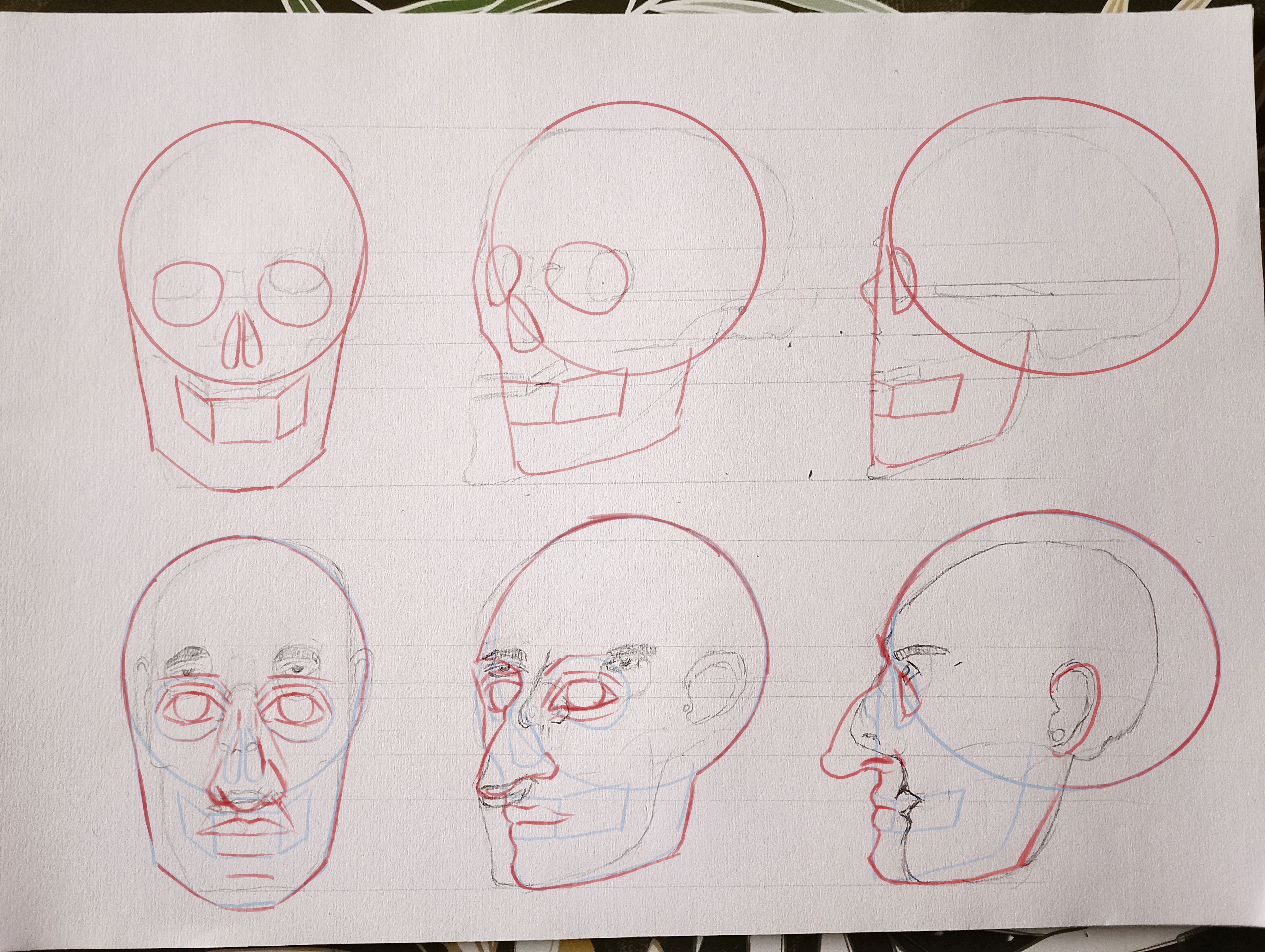 Pense à bien séparer le volume de la boite cranienne du visage dans tes construction puis de bien repérer où sont les points commus des deux (proche des tempes). Construis d'avord le crâne puis ensuite le visage en te fiant à tes premières proportions. Continue 👍