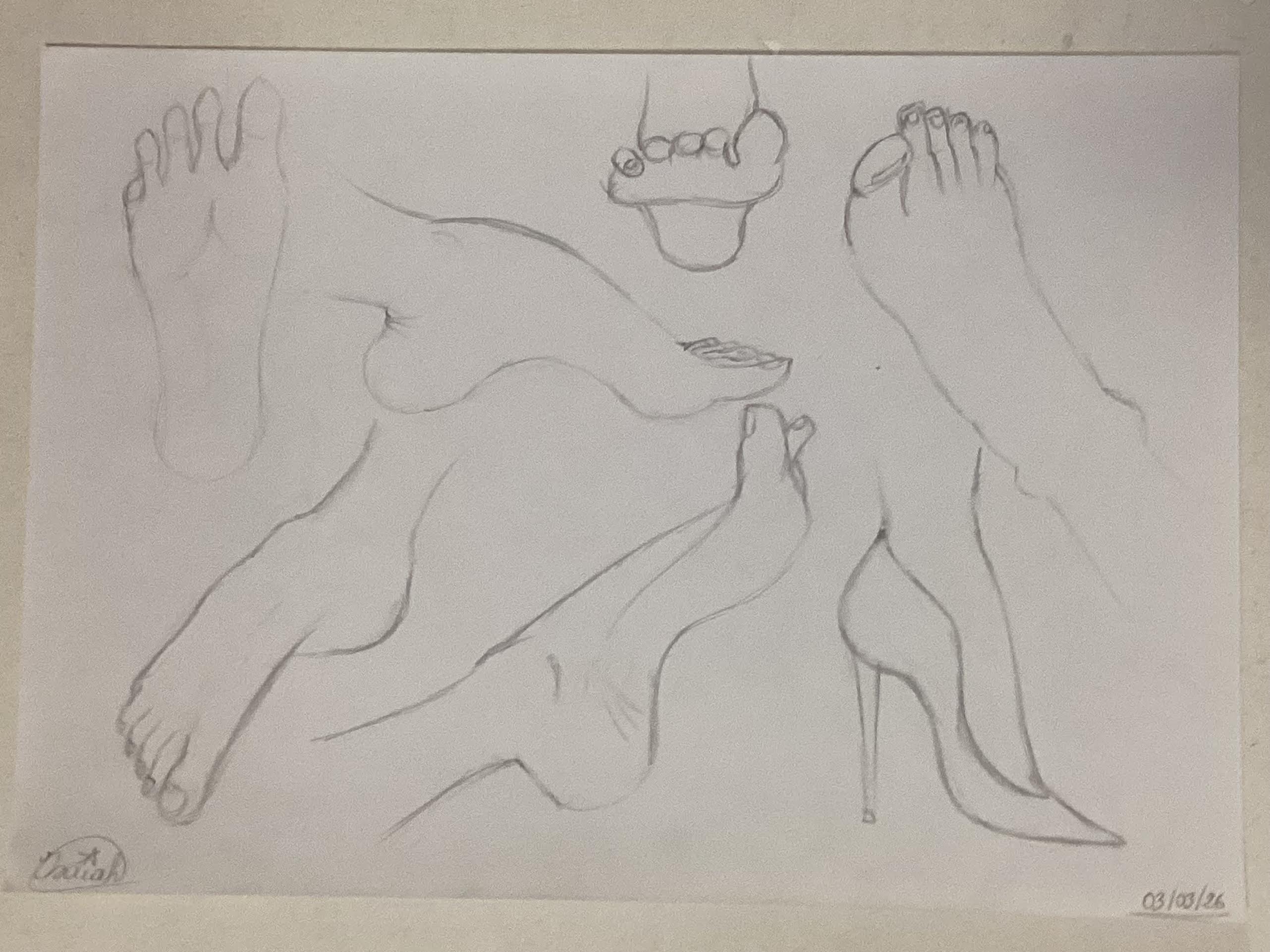 Bon, c'est pas le pied 😬. Plus sèrieusement, voici un premier jet de pieds dessinés pendant la vidéo du cours. Merci pour vos conseils et astuces.