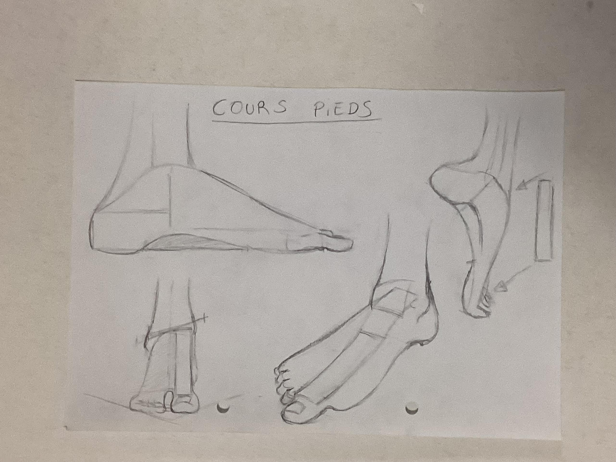 Je te partage quelques corrections rapides pour les dessins de pieds. Observe bien la courbure de la voûte plantaire : les pieds sont plus triangulaires que plats.