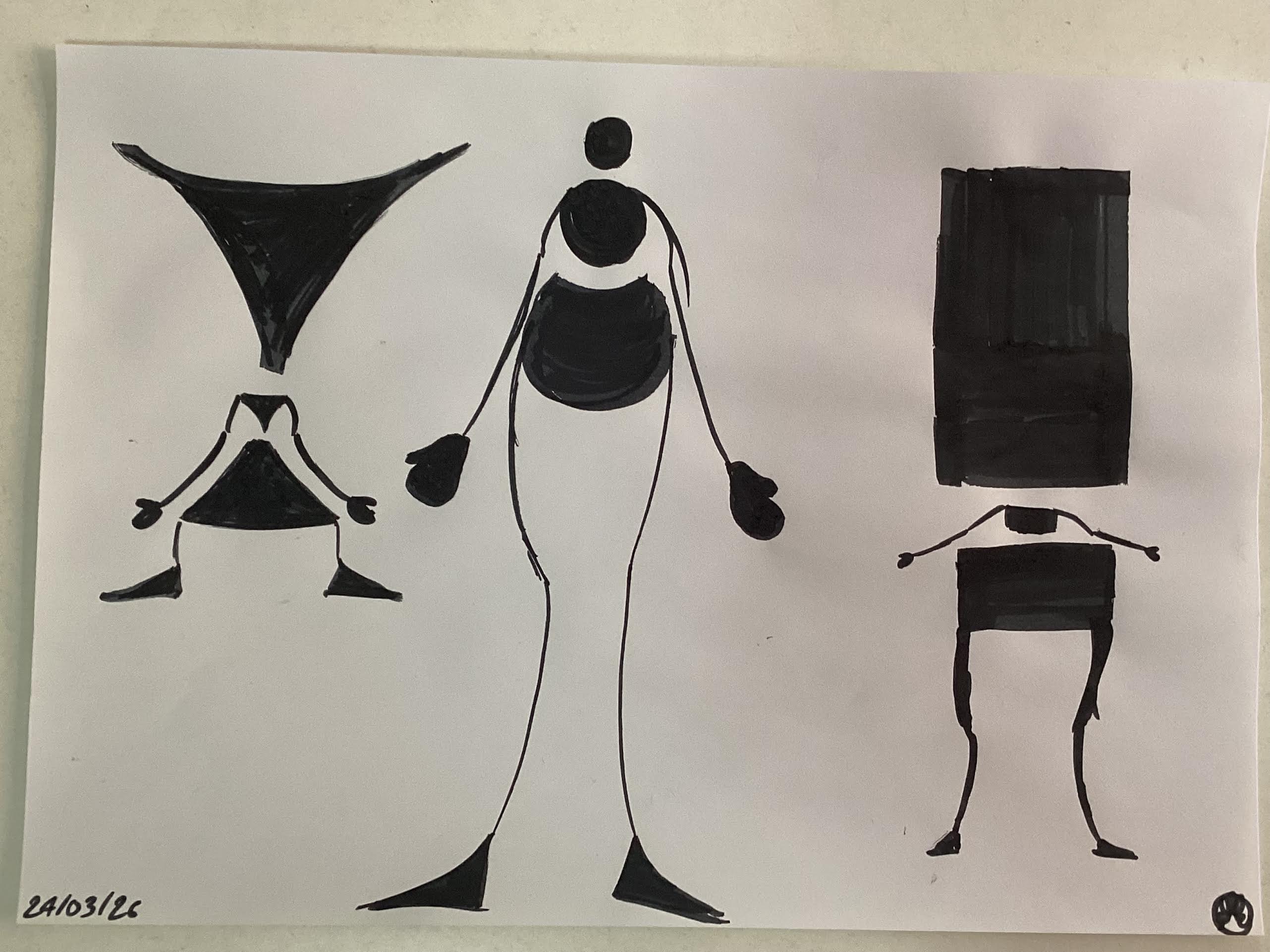 Bonsoir Sylvain, super pour cet exercice des formes simples. Le dernier à droite me fait penser à H2G2 il fonctionne bien ! Tes versions en noir sont très parlantes aussi, tu peux flechir les bras ou leur donner une dynamique en courbe pour éviter un côté trop robotique