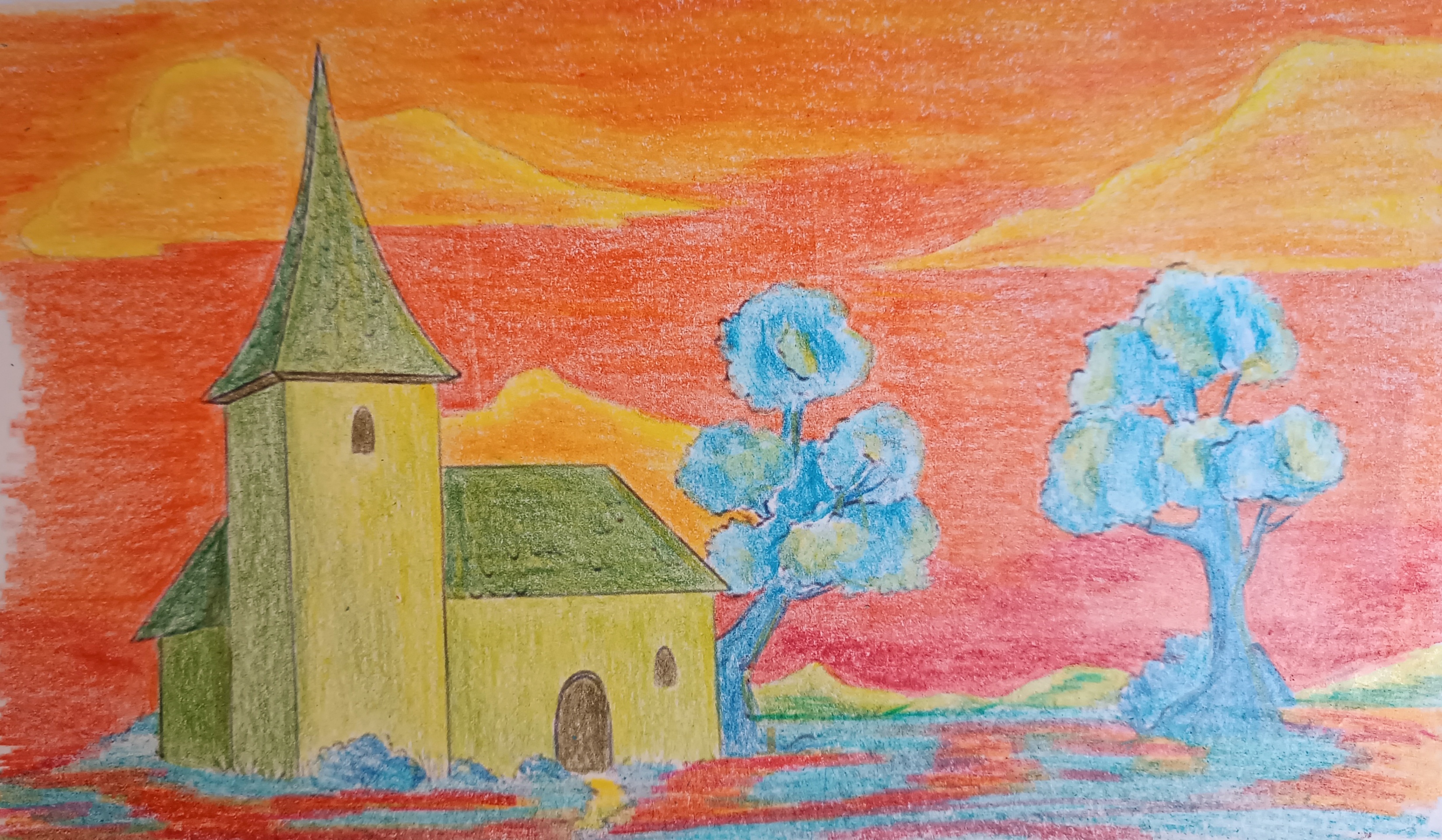 Pour en revenir au sujet de la couleur, il est important que tu te demandes ce qui ne te plaît pas dans ton œuvre et pourquoi, afin d'apprendre de ta propre expérience. Pour l'instant, je dois t'avouer que la couleur de l'église n'est pas la plus adéquate et déséquilibre l'image. Si tu avais limité ta palette uniquement aux oranges et aux bleus, le résultat aurait été plus satisfaisant.