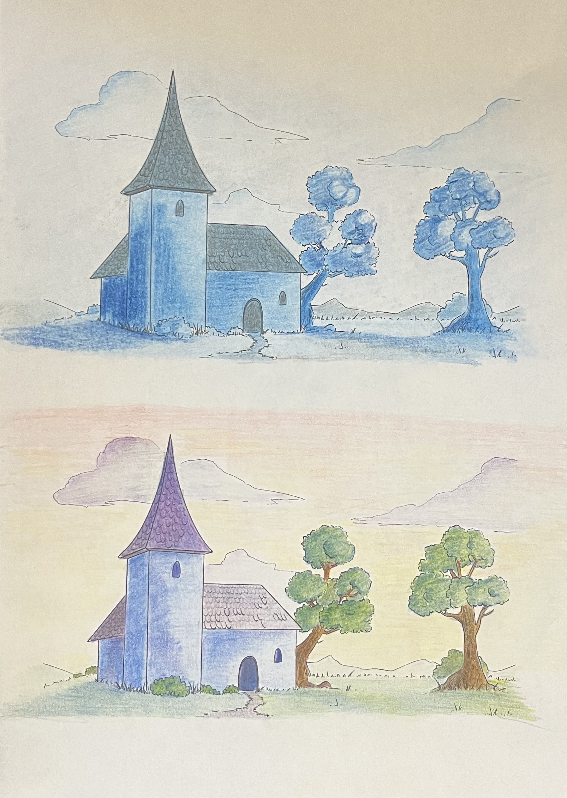 Voici mon exercice aux crayons de couleurs: monochromatique et carré.
