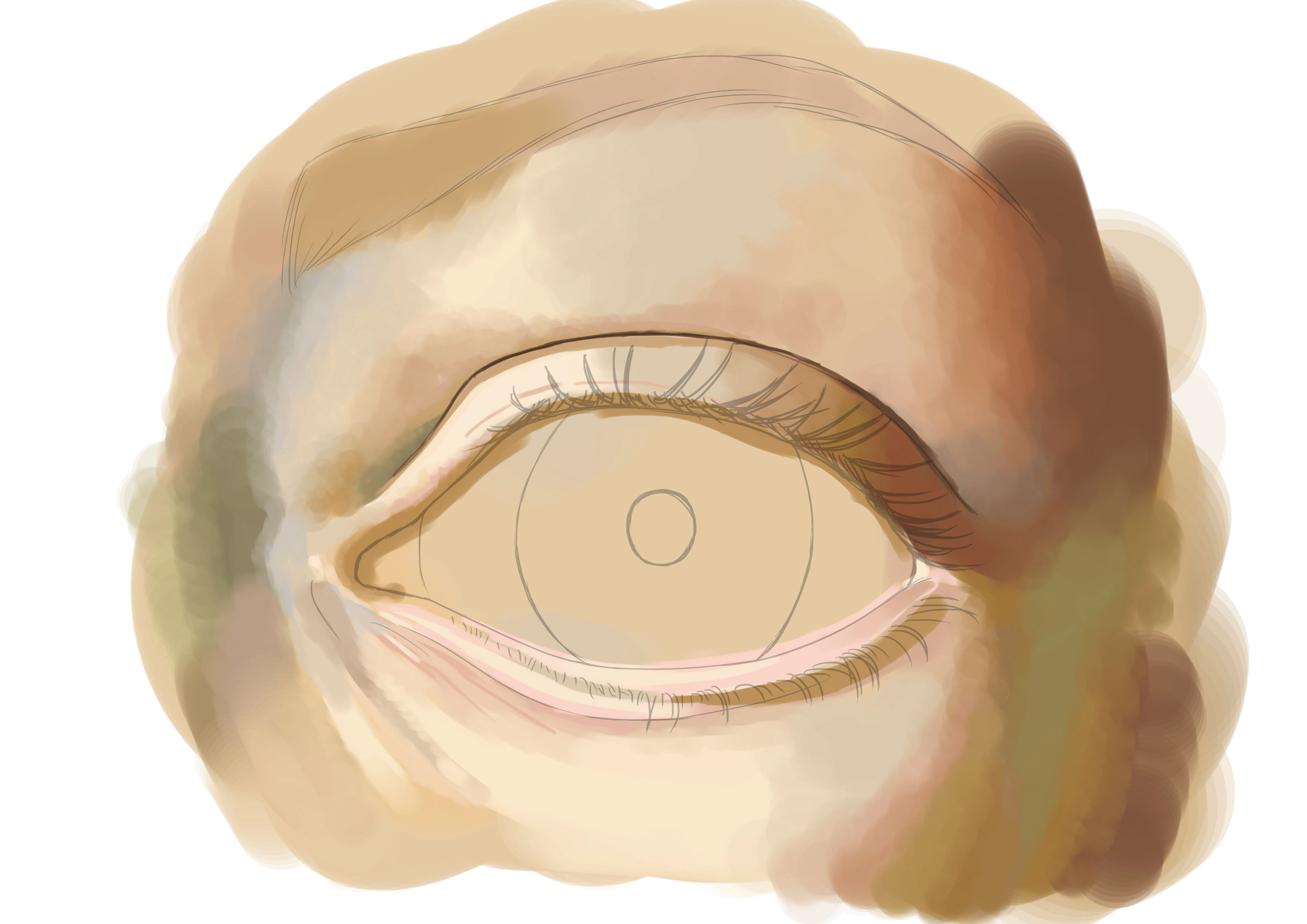 Maintenant le vif du sujet : l’œil ! On va prendre une teinte claire et plutôt grise / beige. Le globe oculaire est une sphère cela signifie qu’il va prendre la lumière sur la partie la plus bombée et que les ombres vont se positionner sur ses bords. Il faut également prendre en compte l’ombre portée de la paupière mobile. J’ajoute donc des teintes plus sombres tirant vers le brun / jaune et le gris pour les ombres.